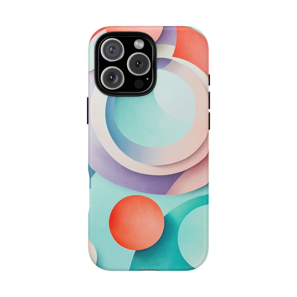 Dit hoesje heeft een abstract ontwerp met overlappende cirkels in verschillende formaten, wat zorgt voor een ruimtelijk 3D-effect. De cirkels zijn uitgevoerd in zachte pasteltinten zoals koraal, turquoise, lila en crème. Het geheel straalt diepte en gelaagdheid uit door de vloeiende kleurverlopen. Het matte hoesje bestaat uit twee stevige lagen van polycarbonaat en TPU en biedt extra bescherming en duurzaamheid. Geschikt voor draadloos opladen.