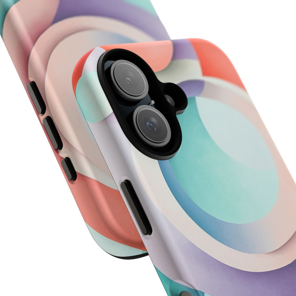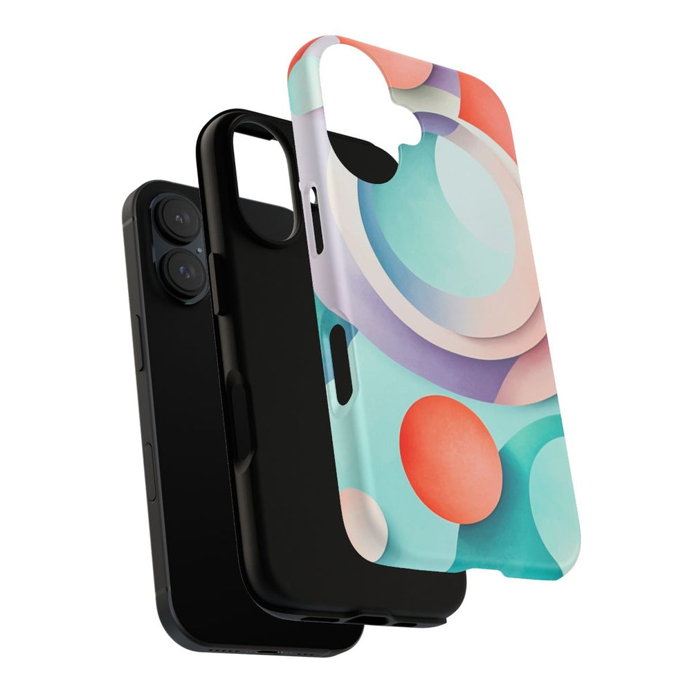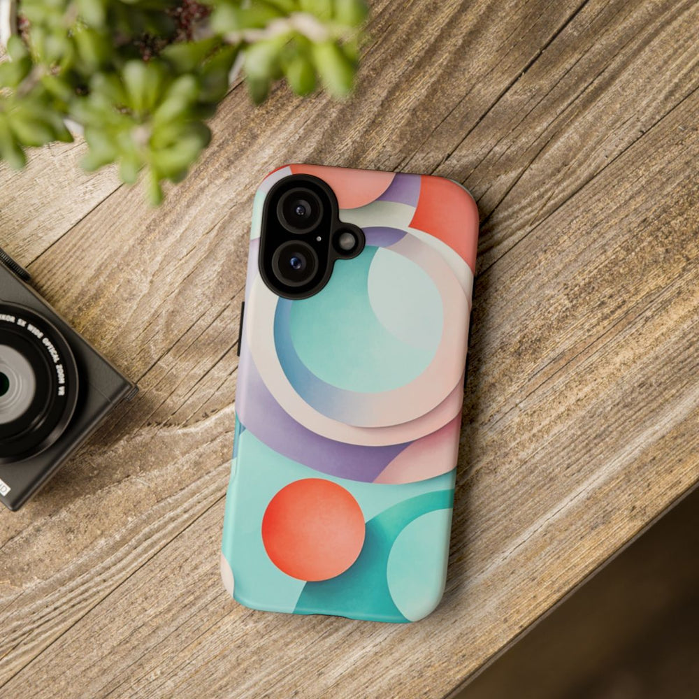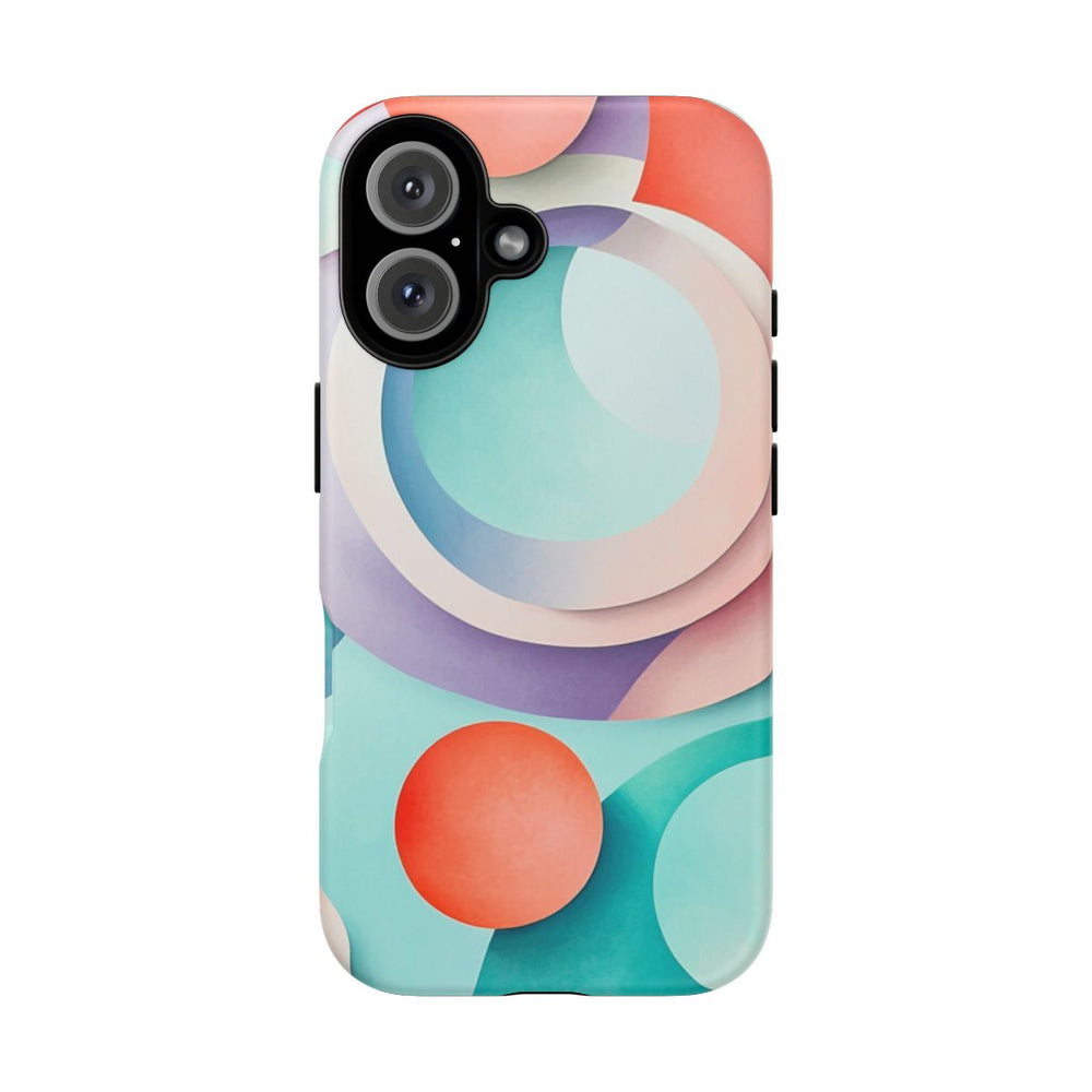 Dit telefoonhoesje heeft een abstract ontwerp met overlappende cirkels in verschillende groottes, waardoor een 3D-effect ontstaat. De cirkels zijn uitgevoerd in zachte pasteltinten zoals koraal, teal, lavendel en crème. Het geheel heeft een gladde, gelaagde uitstraling met subtiele schaduwen die de diepte versterken. Het matte hoesje is voorzien van een stevige polycarbonaat buitenkant en een TPU-binnenlaag, wat zorgt voor dubbele bescherming. Geschikt voor draadloos opladen.