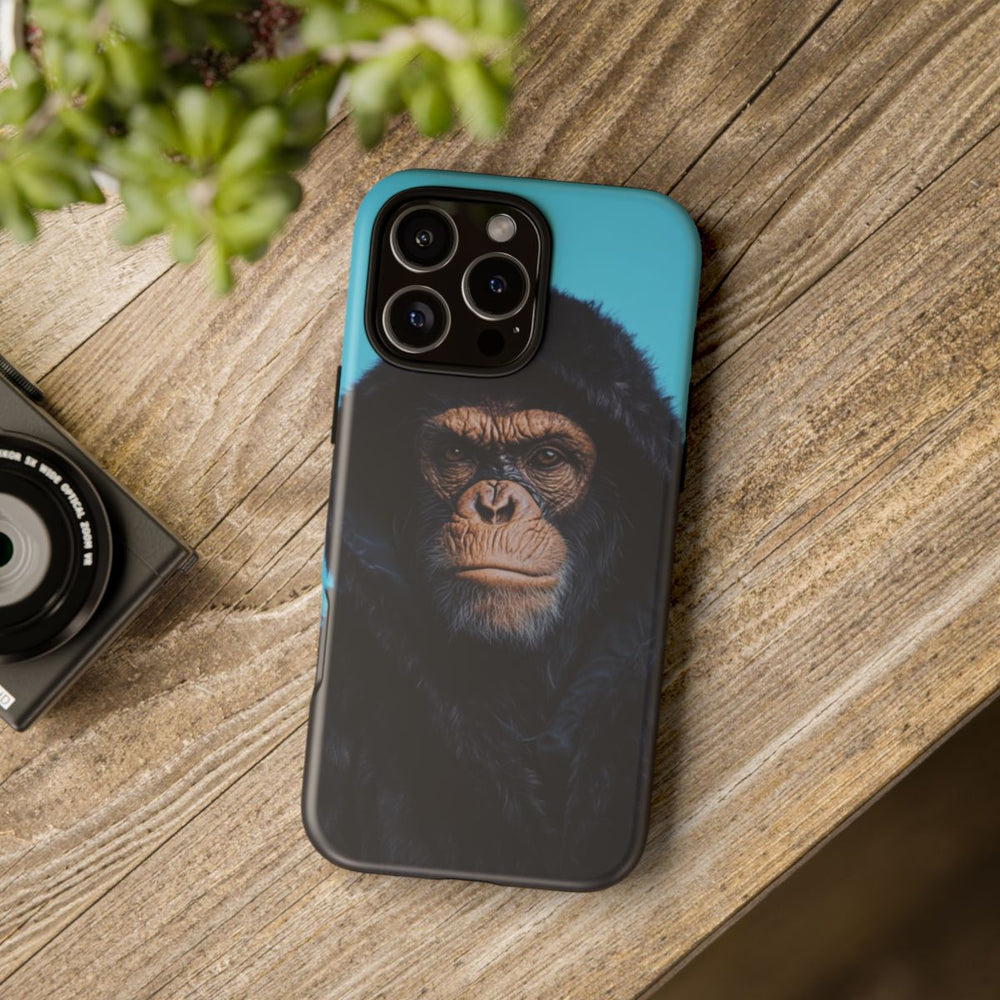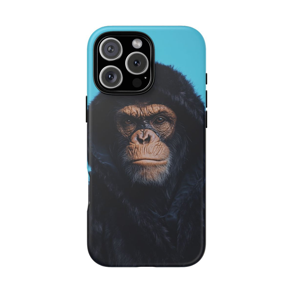 Dit hoesje toont een portret van een aap met een zwarte hoodie van bont, die recht naar de kijker kijkt. De heldere koningsblauwe achtergrond zorgt voor een opvallend contrast met de donkere hoodie. Het hoesje is gemaakt van stevig polycarbonaat met een TPU-binnenkant en biedt goede bescherming voor je toestel. Geschikt voor draadloos opladen, waardoor het hoesje praktisch is in het dagelijks gebruik.