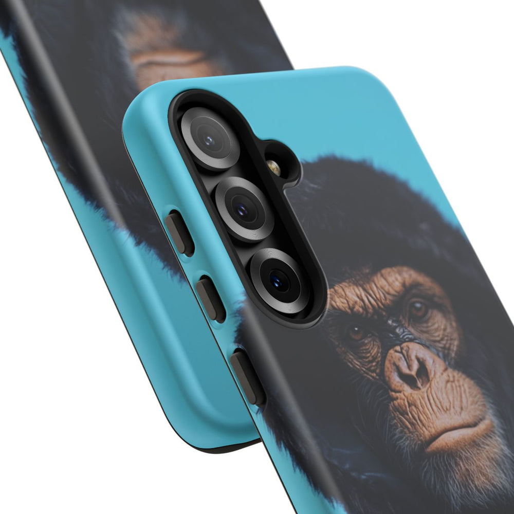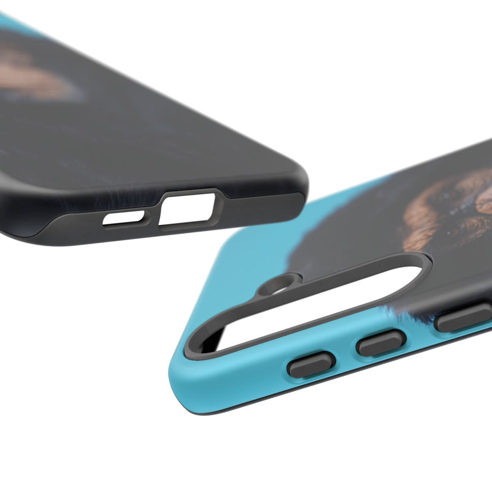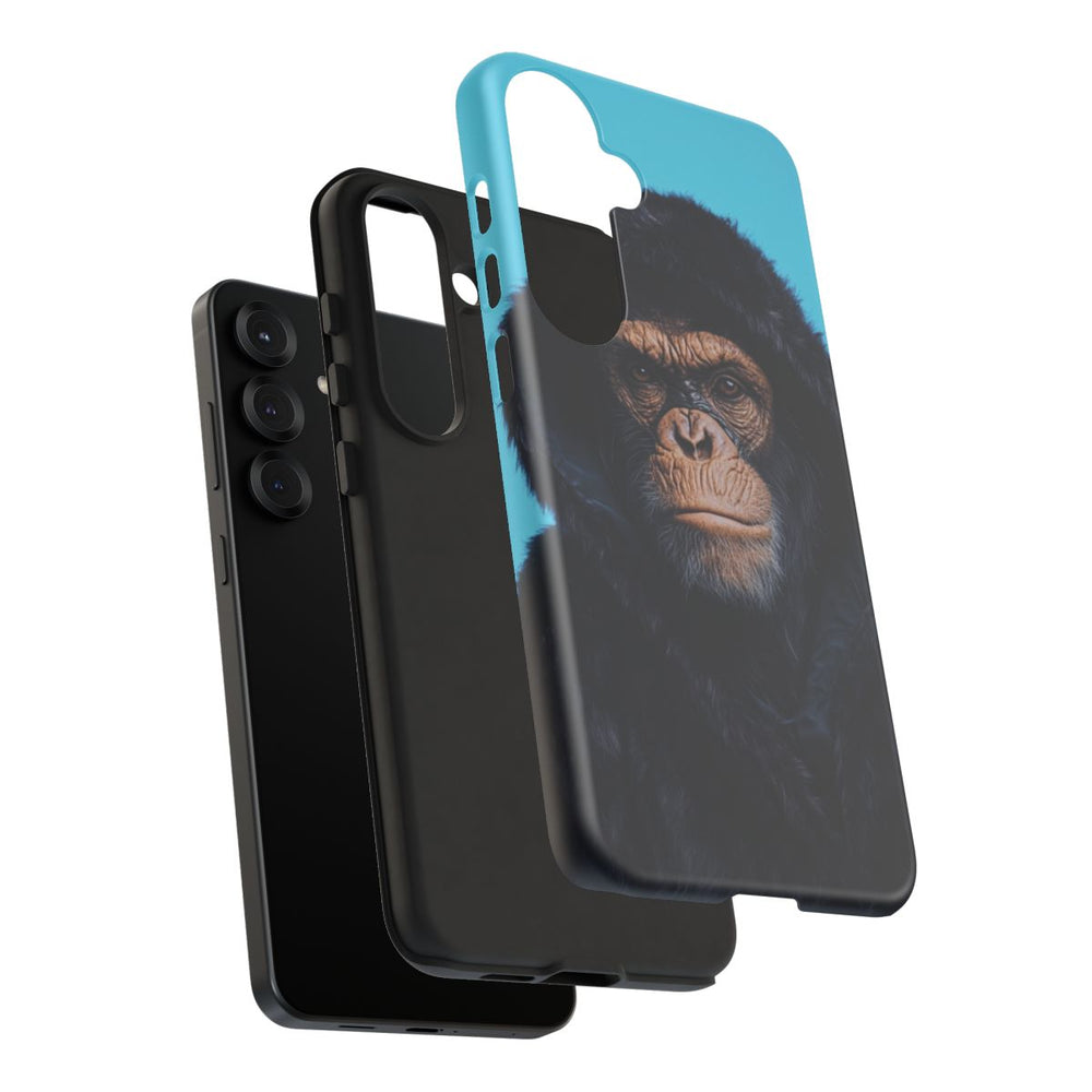 Dit telefoonhoesje toont een portret van een aap met een zwarte hoodie tegen een opvallend koningsblauwe achtergrond. De serieuze blik van de aap en de gedetailleerde textuur van de hoodie geven het ontwerp extra diepte. Het hoesje is gemaakt van stevige materialen en biedt uitstekende bescherming voor je toestel. Daarnaast ondersteunt het draadloos opladen, waardoor je je telefoon gemakkelijk en snel kunt gebruiken.