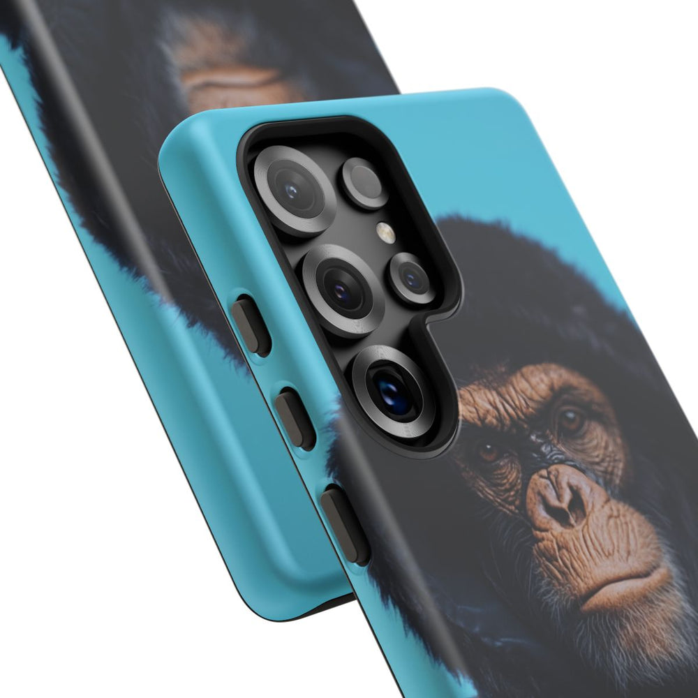 Dit hoesje toont een portret van een aap met een zwarte hoodie op een heldere koningsblauwe achtergrond. De aap kijkt serieus en de structuur van de vacht en de hoodie zijn duidelijk zichtbaar. Het hoesje is gemaakt van stevige materialen en biedt optimale bescherming voor het toestel. Ondersteunt draadloos opladen voor extra gebruiksgemak.