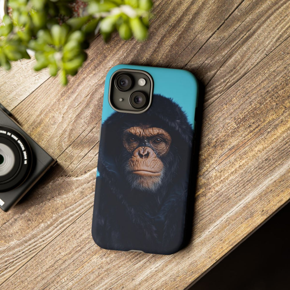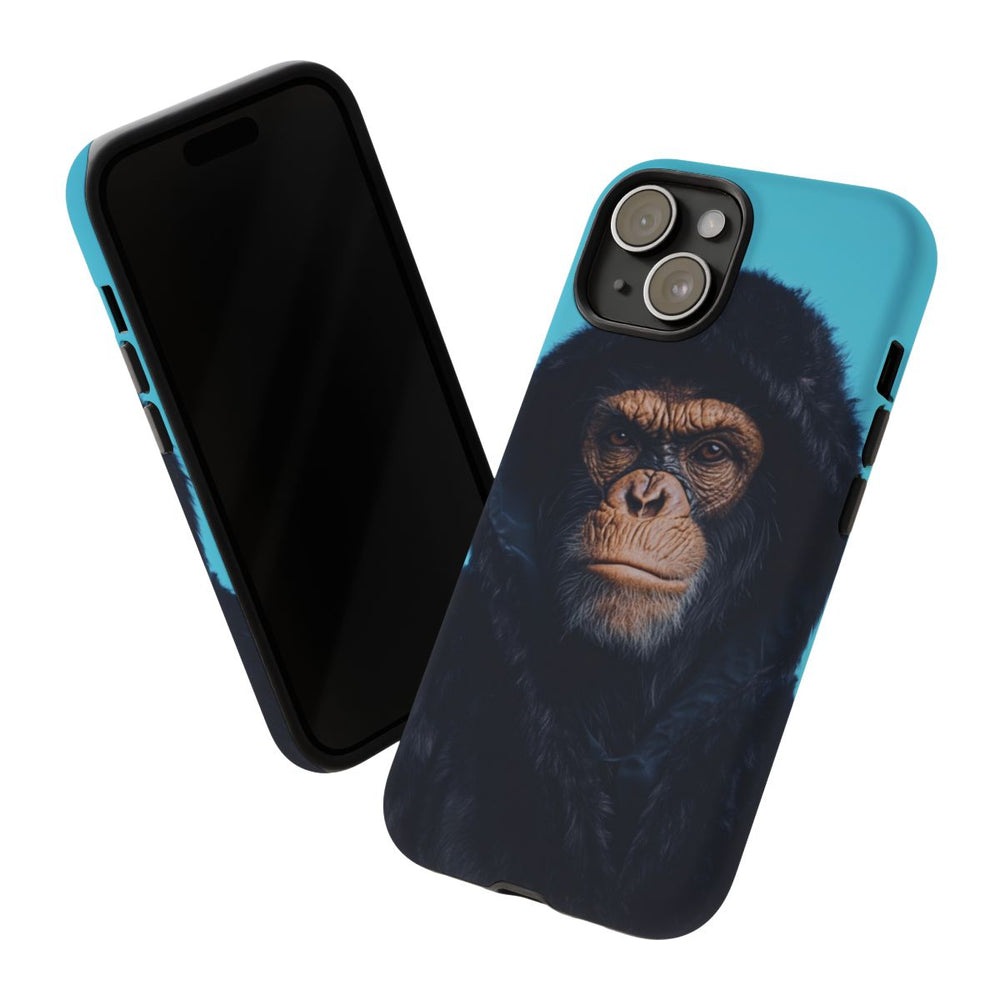 Dit telefoonhoesje toont een portret van een aap met een zwarte bonten hoodie die recht naar de kijker kijkt. De heldere koningsblauwe achtergrond zorgt voor een opvallend contrast met de donkere hoodie. Het matte, stevige hoesje bestaat uit twee lagen voor extra stevigheid en bescherming. Ondersteunt draadloos opladen voor optimaal gebruiksgemak. Het hoesje is speciaal ontworpen voor een perfecte pasvorm en biedt een stijlvolle én praktische bescherming voor jouw toestel.