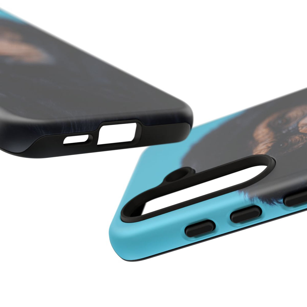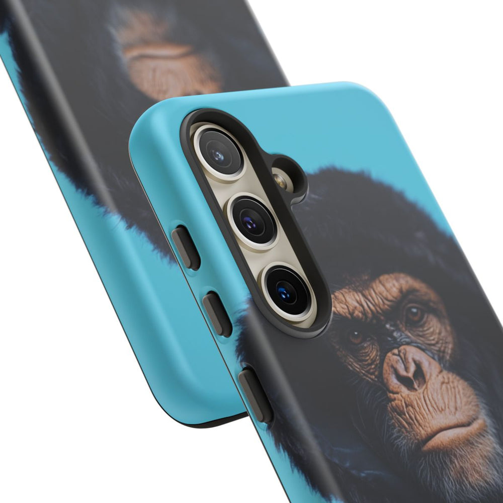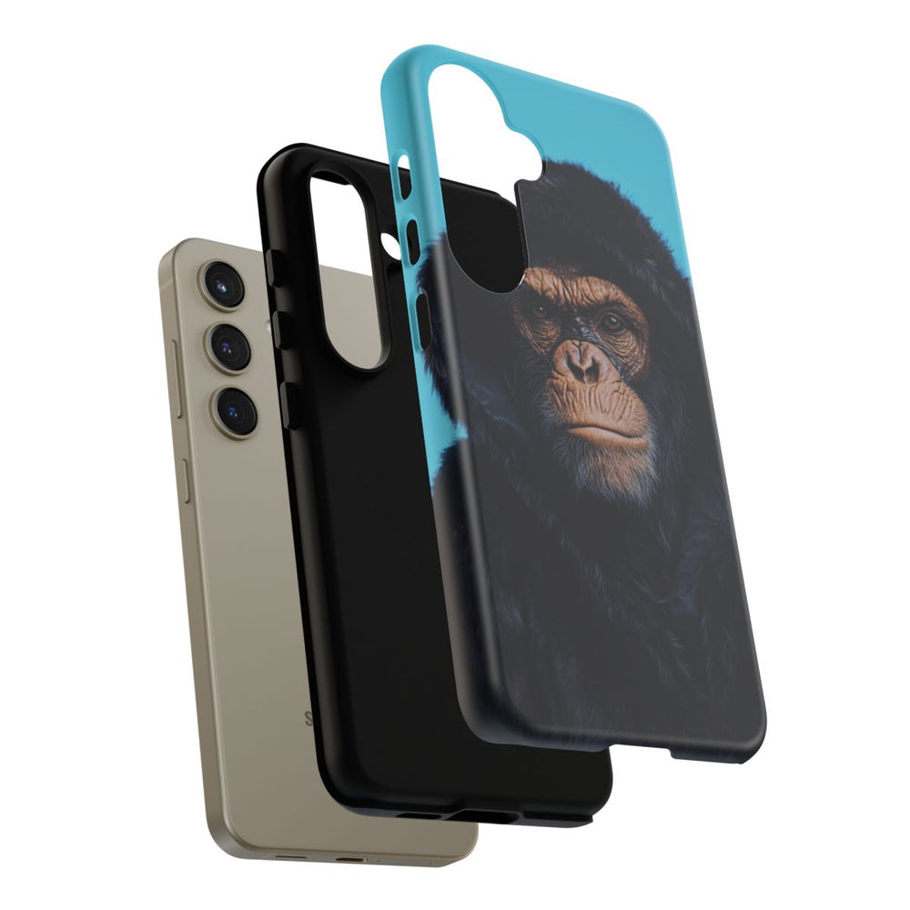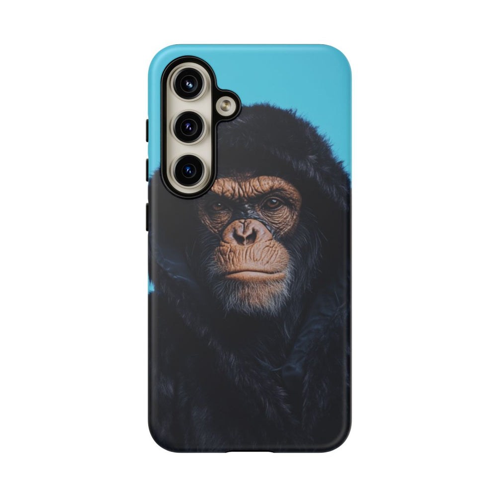 Dit ontwerp toont een aap met een zwarte bonten hoodie die recht vooruit kijkt. De heldere koningsblauwe achtergrond vormt een opvallend contrast met de donkere hoodie. Het hoesje heeft een matte afwerking en geeft je toestel een stijlvolle en unieke uitstraling. Dankzij de stevige materialen biedt het hoesje goede bescherming voor je telefoon. Daarnaast is het hoesje geschikt voor draadloos opladen, wat het extra praktisch maakt voor dagelijks gebruik.