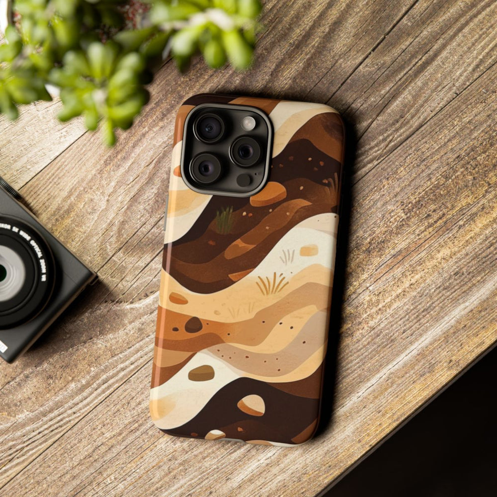 Dit hoesje heeft een abstract patroon van gelaagde aarde in verschillende tinten bruin, beige en crème. De lagen lopen in golvende, organische vormen, afgewisseld met kleine steentjes en hier en daar wat gras. Het geheel doet denken aan natuurlijke aardetexturen met een warme, aardse kleurstelling. Het patroon is gedrukt op een glanzend, stevig hoesje van polycarbonaat en TPU, dat bestaat uit twee lagen voor extra bescherming en geschikt is voor draadloos opladen. Het ontwerp benadrukt natuurlijke elementen en organische vormen.