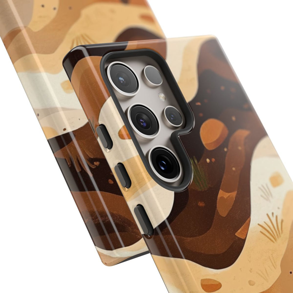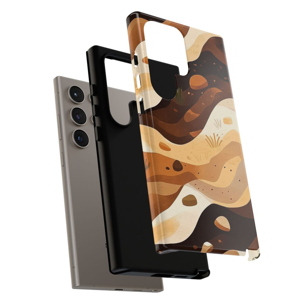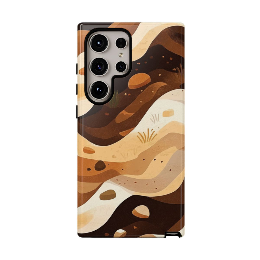 Dit hoesje heeft een abstract patroon van gelaagde aarde in verschillende tinten bruin, beige en crème. De lagen lopen in golvende, organische vormen, afgewisseld met kleine steentjes en hier en daar wat gras. Het geheel doet denken aan natuurlijke aardetexturen met een warme, aardse kleurstelling. Het patroon is gedrukt op een glanzend, stevig hoesje van polycarbonaat en TPU, dat bestaat uit twee lagen voor extra bescherming en geschikt is voor draadloos opladen. Het ontwerp benadrukt natuurlijke elementen en organische vormen.