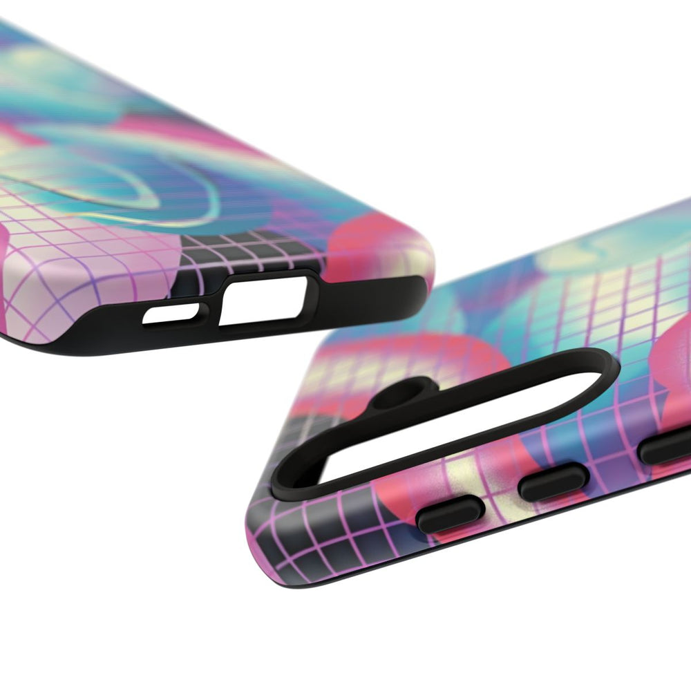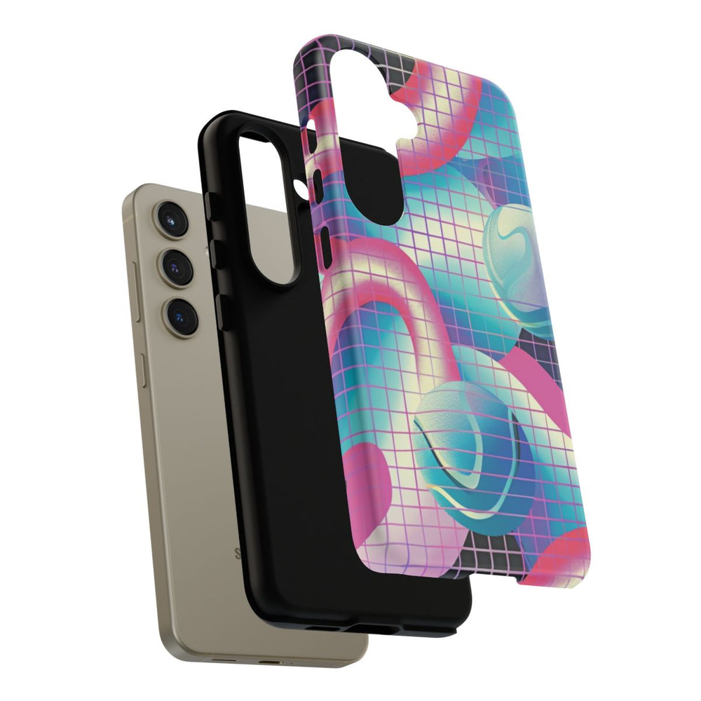 Dit ontwerp toont een abstract 3D-geometrisch patroon met vloeiende, buisvormige vormen in roze- en lichtpaarse tinten. Blauwe en turquoise bolvormige elementen met golvende patronen zweven over de compositie. Een roze raster ligt als een overlay over het gehele beeld, wat zorgt voor structuur en diepte. De achtergrond bestaat uit zachte kleurverlopen van blauw, wit en zwart, wat een dynamisch en modern visueel effect geeft. Het hoesje heeft een dubbele laag met een matte afwerking, een polycarbonaat buitenkant en een TPU-binnenzijde, en ondersteunt draadloos opladen.