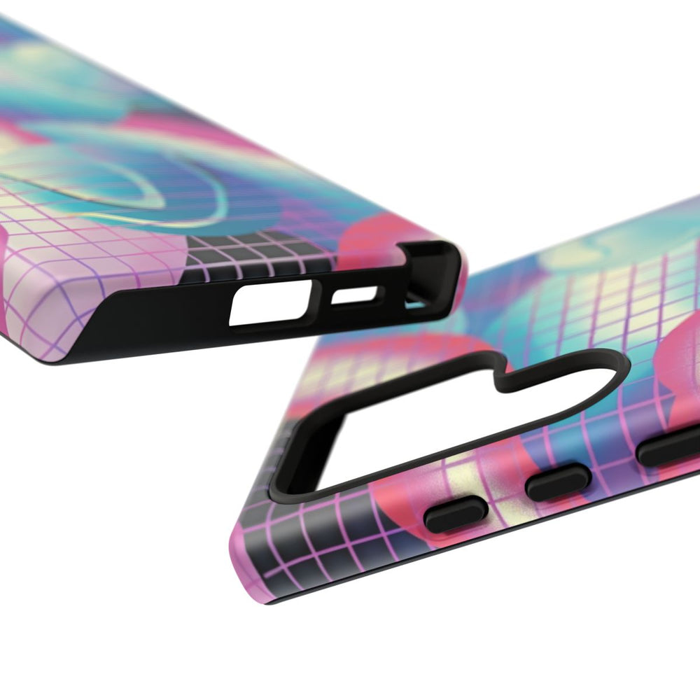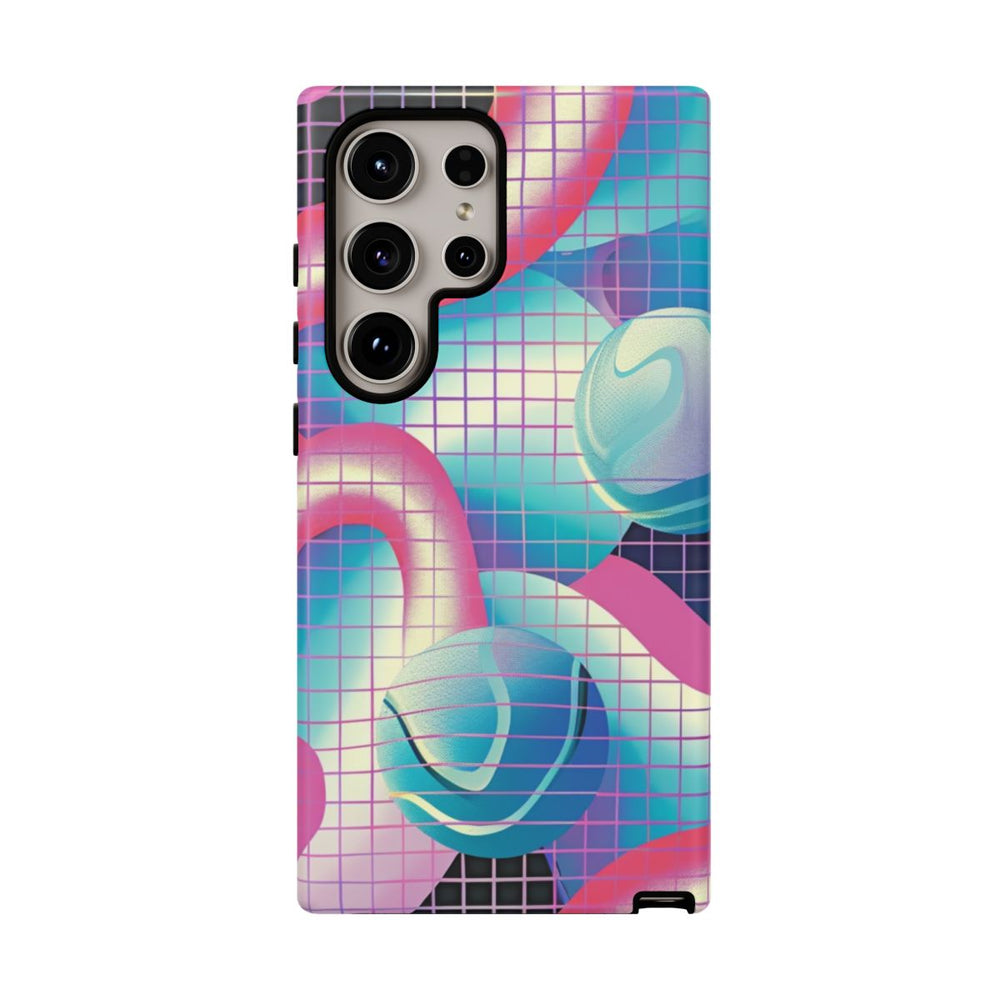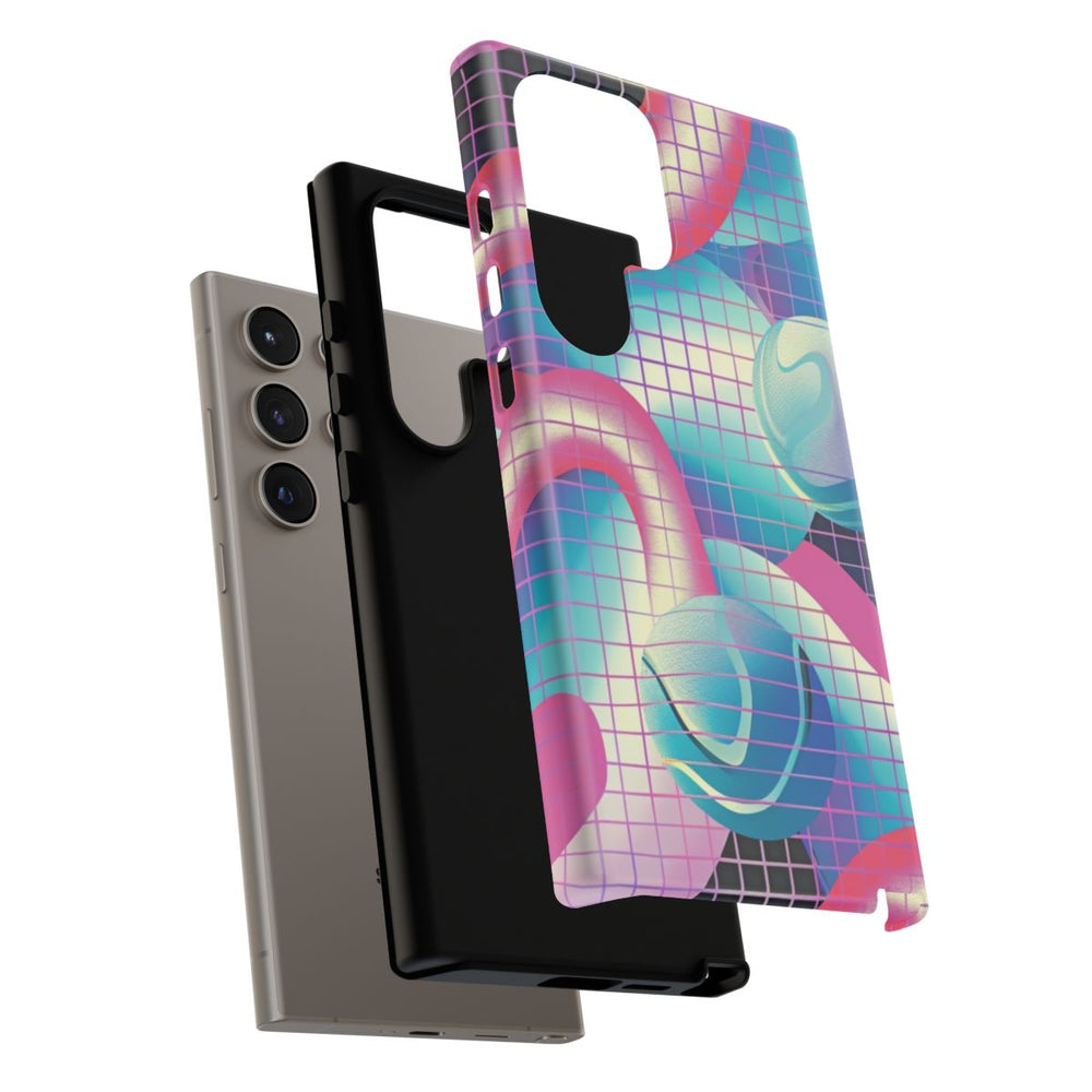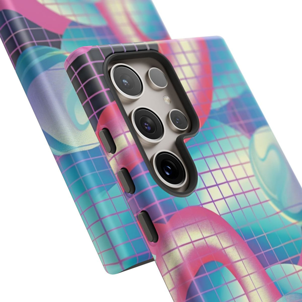 Dit ontwerp toont een abstract 3D-geometrisch patroon met vloeiende, buisvormige vormen in roze- en lichtpaarse tinten. Blauwe en turquoise bolvormige elementen met golvende patronen zweven over de compositie. Een roze raster ligt als een overlay over het gehele beeld, wat zorgt voor structuur en diepte. De achtergrond bestaat uit zachte kleurverlopen van blauw, wit en zwart, wat een dynamisch en modern visueel effect geeft. Het hoesje heeft een dubbele laag met een matte afwerking, een polycarbonaat buitenkant en een TPU-binnenzijde, en ondersteunt draadloos opladen.