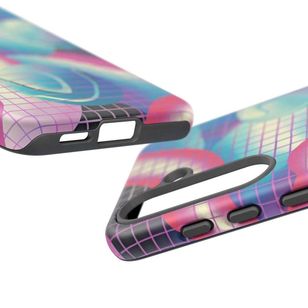 Dit ontwerp toont een abstract 3D-geometrisch patroon met vloeiende, buisvormige vormen in roze- en lichtpaarse tinten. Blauwe en turquoise bolvormige elementen met golvende patronen zweven over de compositie. Een roze raster ligt als een overlay over het gehele beeld, wat zorgt voor structuur en diepte. De achtergrond bestaat uit zachte kleurverlopen van blauw, wit en zwart, wat een dynamisch en modern visueel effect geeft. Het hoesje heeft een dubbele laag met een matte afwerking, een polycarbonaat buitenkant en een TPU-binnenzijde, en ondersteunt draadloos opladen.