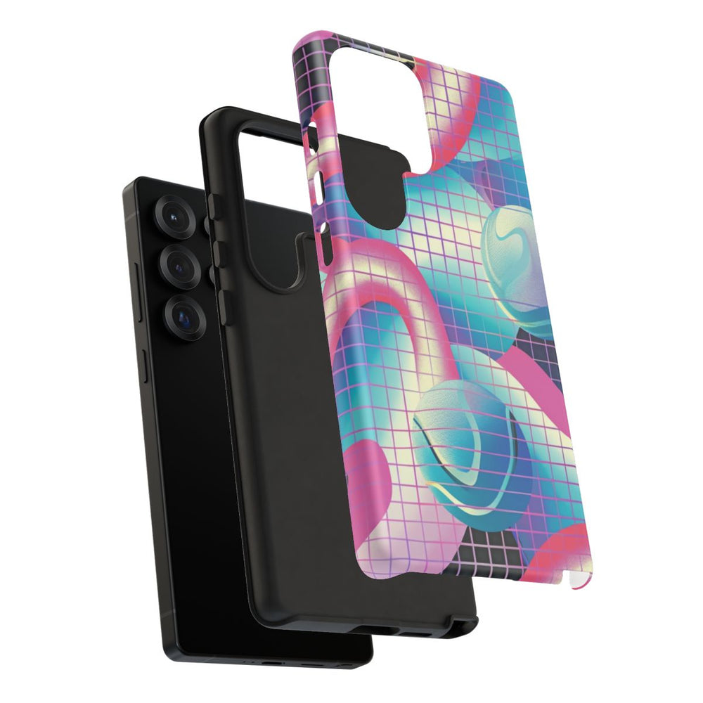 Dit ontwerp toont een abstract 3D-geometrisch patroon met vloeiende, buisvormige vormen in roze- en lichtpaarse tinten. Blauwe en turquoise bolvormige elementen met golvende patronen zweven over de compositie. Een roze raster ligt als een overlay over het gehele beeld, wat zorgt voor structuur en diepte. De achtergrond bestaat uit zachte kleurverlopen van blauw, wit en zwart, wat een dynamisch en modern visueel effect geeft. Het hoesje heeft een dubbele laag met een matte afwerking, een polycarbonaat buitenkant en een TPU-binnenzijde, en ondersteunt draadloos opladen.