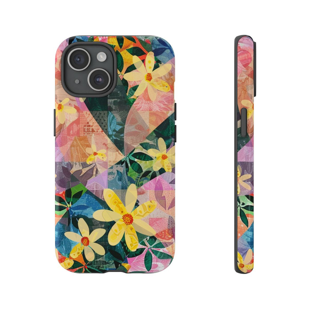 Dit hoesje heeft een abstract ontwerp met overlappende geometrische vormen en bloemaccenten. Gele bloemen met rode harten zijn verspreid over een achtergrond van gelaagde vormen in diverse kleuren zoals groen, roze, paars, blauw en oranje. Het patroon zorgt voor een levendig en dynamisch visueel effect. Het glanzende, stevige hoesje bestaat uit een dubbele laag met een polycarbonaat buitenkant en een TPU-binnenzijde. Dit biedt extra bescherming en is geschikt voor draadloos opladen.