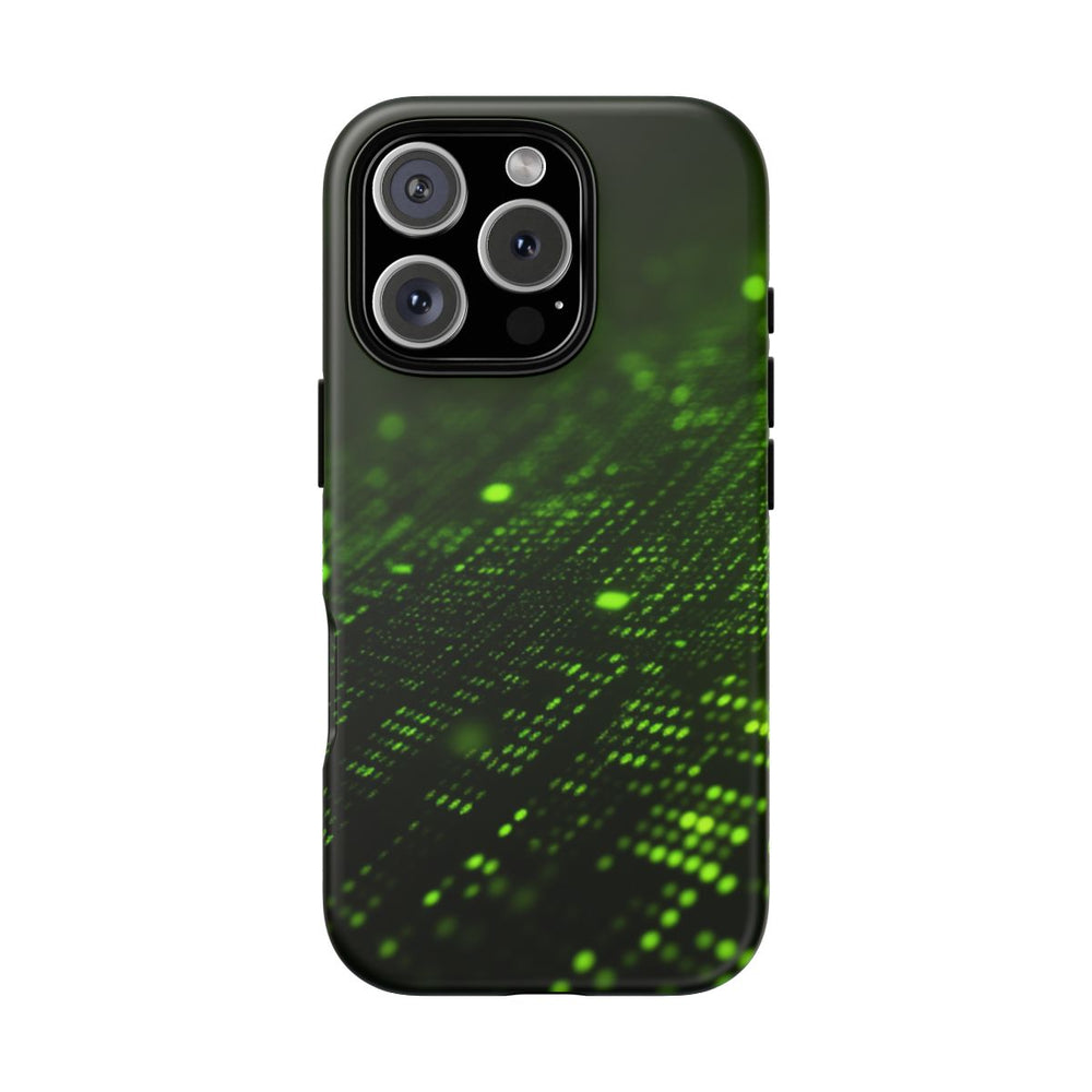 Dit hoesje heeft een abstract digitaal raster van talloze kleine groene lichtdeeltjes, gerangschikt in een matrixachtig patroon. De lichtgevende stippen zorgen voor diepte en beweging, terwijl de donkere achtergrond de levendige groene tinten extra laat opvallen. Het hoesje bestaat uit twee lagen: een stevige polycarbonaat buitenkant en een TPU-binnenzijde voor optimale bescherming en duurzaamheid. Draadloos opladen wordt ondersteund, maar het hoesje is niet geschikt voor MagSafe.