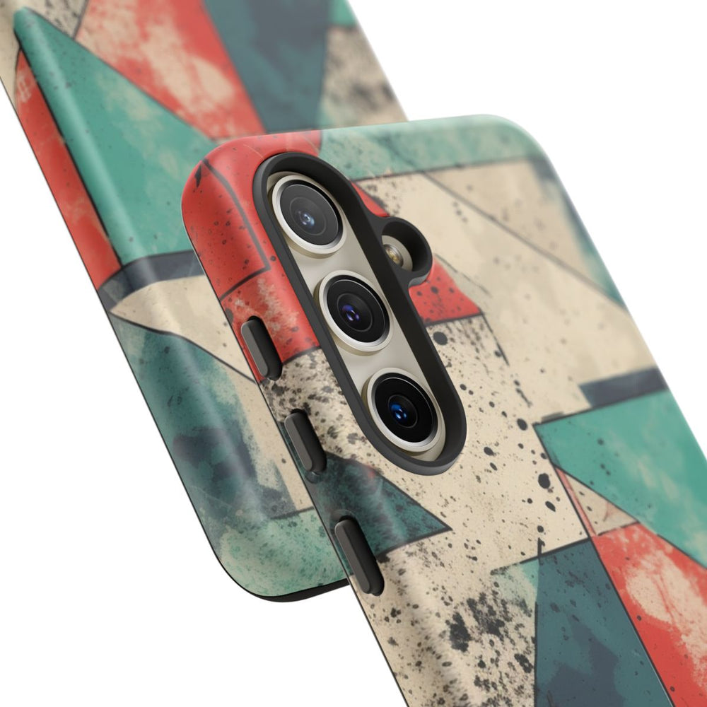 Dit hoesje heeft een abstract geometrisch patroon met diverse driehoeken en vierhoeken in gedempte tinten teal, rood en donkerblauw. De vormen zijn omlijnd met dunne zwarte lijnen en liggen op een beige achtergrond met een ruwe, verweerde uitstraling, voorzien van verspreide zwarte spikkels en vegen. Het ontwerp heeft een artistieke, versleten look met inktspatten en vervaagde delen, wat zorgt voor een hippe, vintage sfeer. Het hoesje bestaat uit twee stevige lagen met een matte afwerking: een polycarbonaat buitenkant en een TPU-binnenzijde. Geschikt voor draadloos opladen.