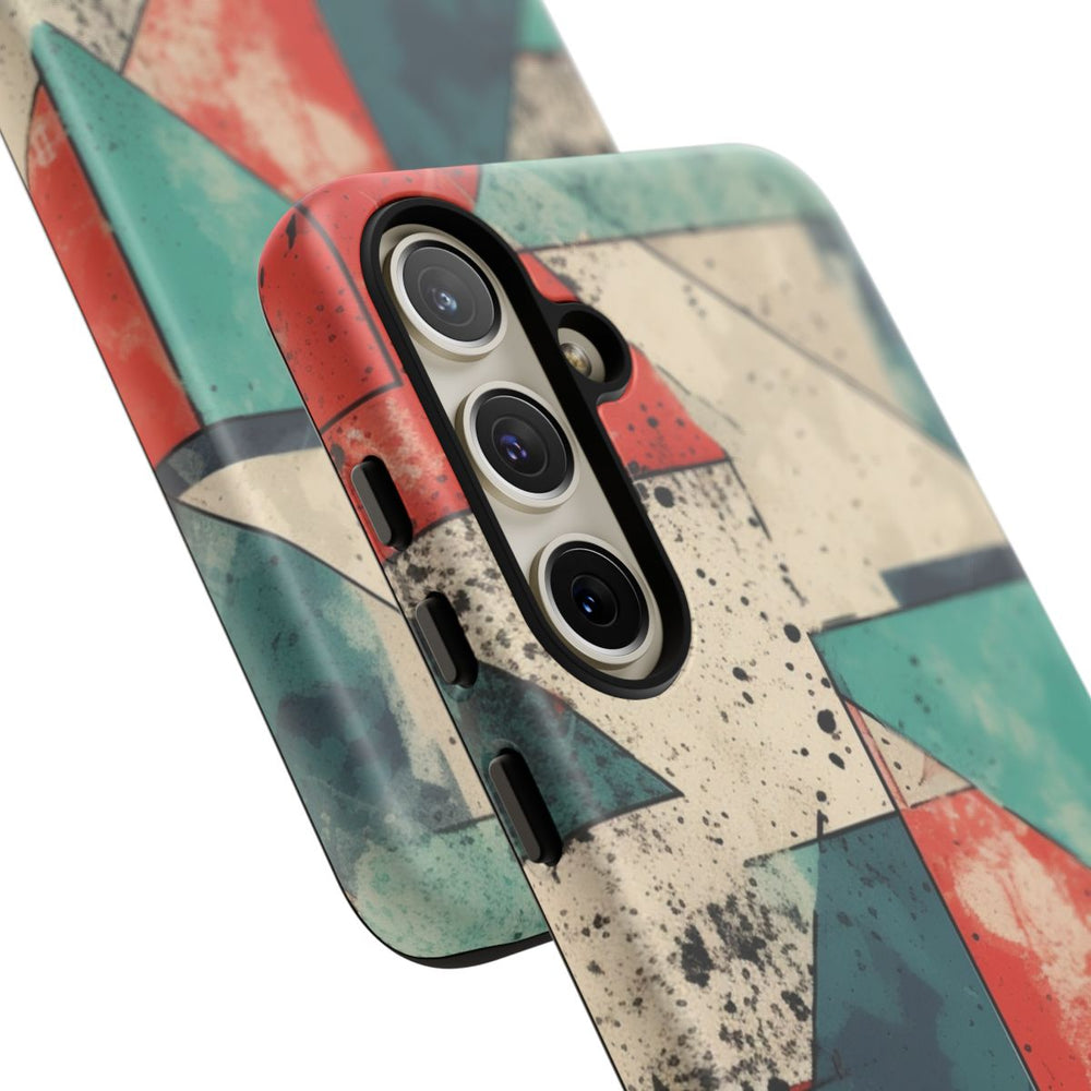Dit hoesje heeft een abstract geometrisch patroon met diverse driehoeken en vierhoeken in gedempte tinten teal, rood en donkerblauw. De vormen zijn omlijnd met dunne zwarte lijnen en liggen op een beige achtergrond met een ruwe, verweerde uitstraling, voorzien van verspreide zwarte spikkels en vegen. Het ontwerp heeft een artistieke, versleten look met inktspatten en vervaagde delen, wat zorgt voor een hippe, vintage sfeer. Het hoesje bestaat uit twee stevige lagen met een matte afwerking: een polycarbonaat buitenkant en een TPU-binnenzijde. Geschikt voor draadloos opladen.