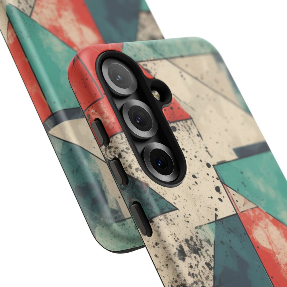 Dit hoesje heeft een abstract geometrisch patroon met diverse driehoeken en vierhoeken in gedempte tinten teal, rood en donkerblauw. De vormen zijn omlijnd met dunne zwarte lijnen en liggen op een beige achtergrond met een ruwe, verweerde uitstraling, voorzien van verspreide zwarte spikkels en vegen. Het ontwerp heeft een artistieke, versleten look met inktspatten en vervaagde delen, wat zorgt voor een hippe, vintage sfeer. Het hoesje bestaat uit twee stevige lagen met een matte afwerking: een polycarbonaat buitenkant en een TPU-binnenzijde. Geschikt voor draadloos opladen.