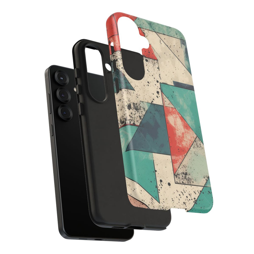Dit hoesje heeft een abstract geometrisch patroon met diverse driehoeken en vierhoeken in gedempte tinten teal, rood en donkerblauw. De vormen zijn omlijnd met dunne zwarte lijnen en liggen op een beige achtergrond met een ruwe, verweerde uitstraling, voorzien van verspreide zwarte spikkels en vegen. Het ontwerp heeft een artistieke, versleten look met inktspatten en vervaagde delen, wat zorgt voor een hippe, vintage sfeer. Het hoesje bestaat uit twee stevige lagen met een matte afwerking: een polycarbonaat buitenkant en een TPU-binnenzijde. Geschikt voor draadloos opladen.