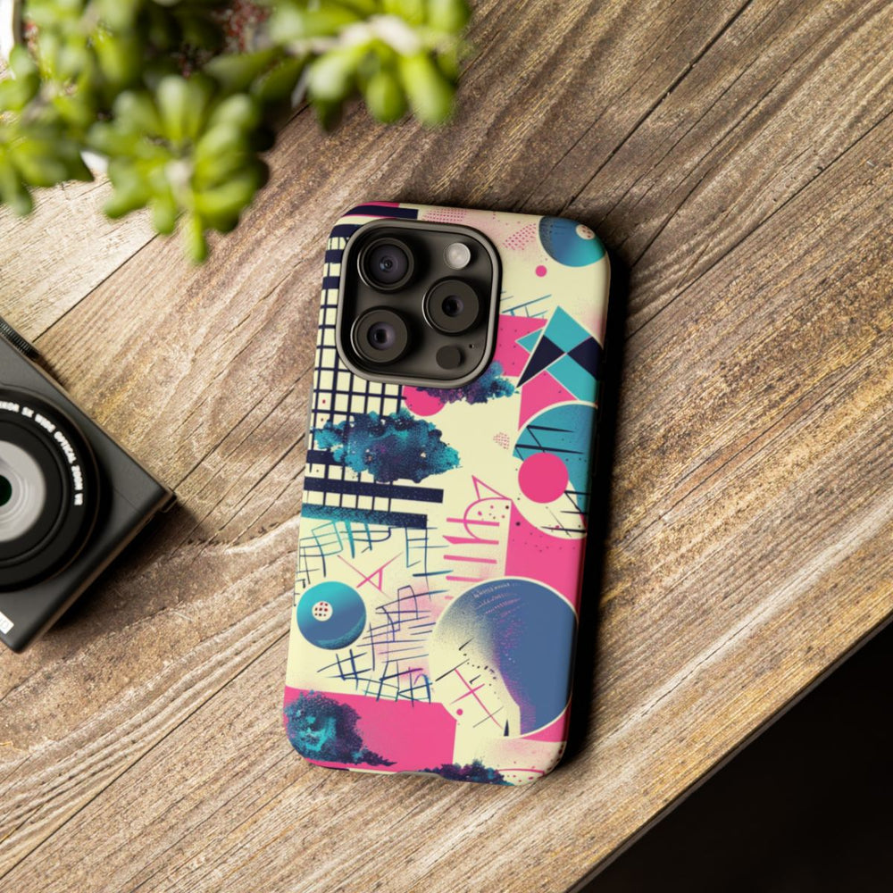 Dit hoesje heeft een abstract geometrisch patroon met een combinatie van cirkels, rasters en hoekige vormen in tinten roze, blauw en zwart op een lichte crèmekleurige achtergrond. Het ontwerp is verrijkt met textuurelementen die doen denken aan wolken en verspreide stippen, wat zorgt voor een dynamische en moderne uitstraling. Het hoesje bestaat uit een dubbele laag van polycarbonaat en TPU, wat zorgt voor stevigheid en bescherming. Geschikt voor draadloos opladen en bestand tegen weersinvloeden.