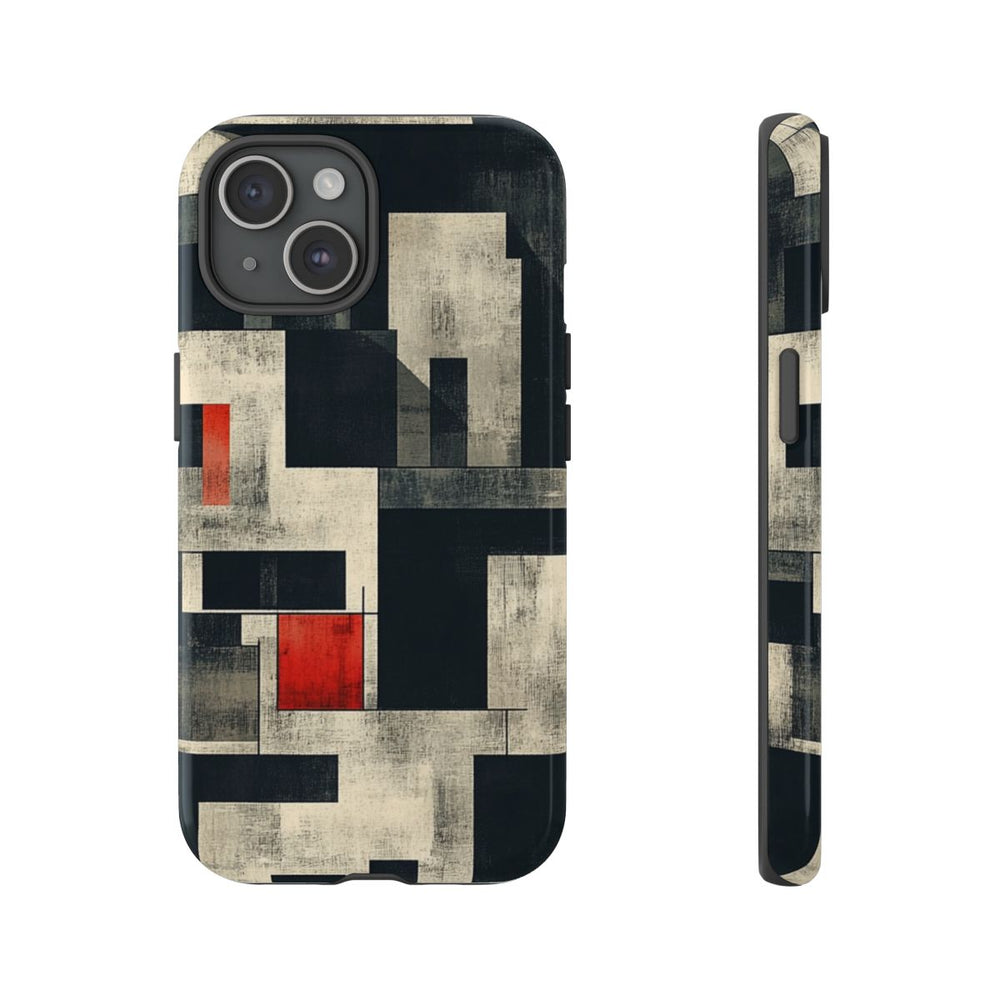 Dit hoesje heeft een abstract geometrisch patroon van overlappende rechthoeken en vierkanten. De kleuren zijn voornamelijk zwart, wit en grijs met een ruwe, verweerde uitstraling door de getextureerde schaduwen. Opvallende rode rechthoeken zorgen voor een krachtig contrast binnen het ontwerp. De stijl is modern en minimalistisch, met een herhalend patroon. Het hoesje is glanzend en stevig, gemaakt van polycarbonaat en TPU voor dubbele bescherming. Geschikt voor draadloos opladen.
