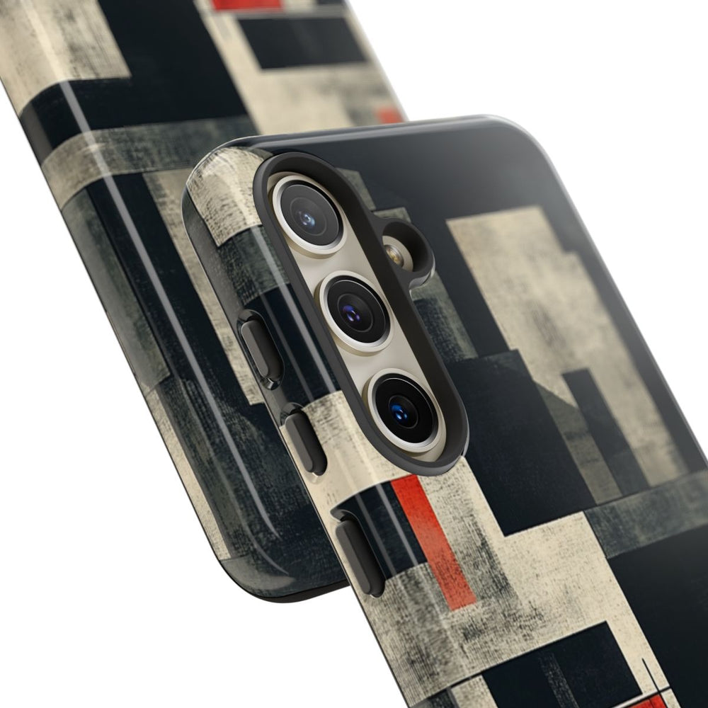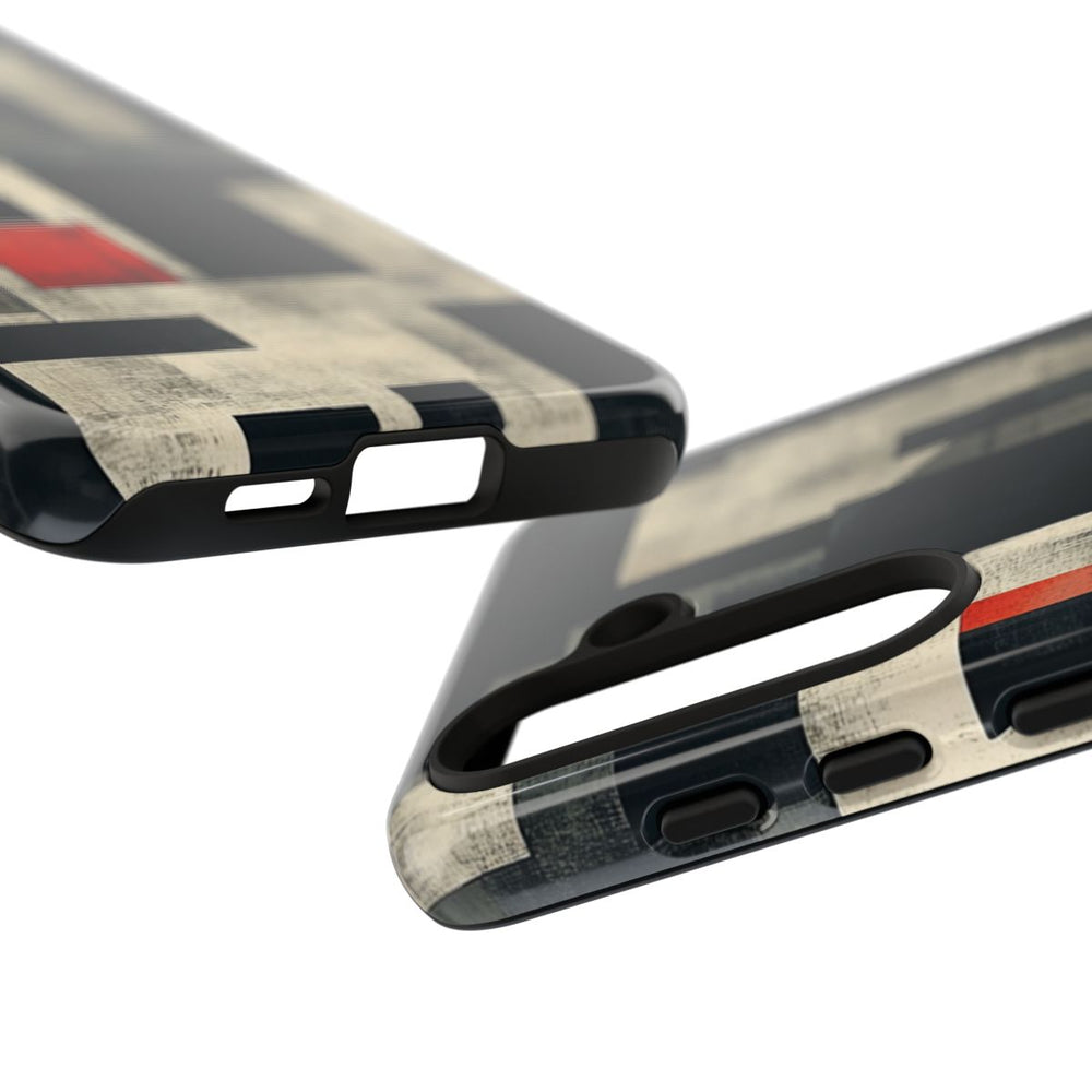 Dit hoesje heeft een abstract geometrisch patroon van overlappende rechthoeken en vierkanten. De kleuren zijn voornamelijk zwart, wit en grijs met een ruwe, verweerde uitstraling door de getextureerde schaduwen. Opvallende rode rechthoeken zorgen voor een krachtig contrast binnen het ontwerp. De stijl is modern en minimalistisch, met een herhalend patroon. Het hoesje is glanzend en stevig, gemaakt van polycarbonaat en TPU voor dubbele bescherming. Geschikt voor draadloos opladen.