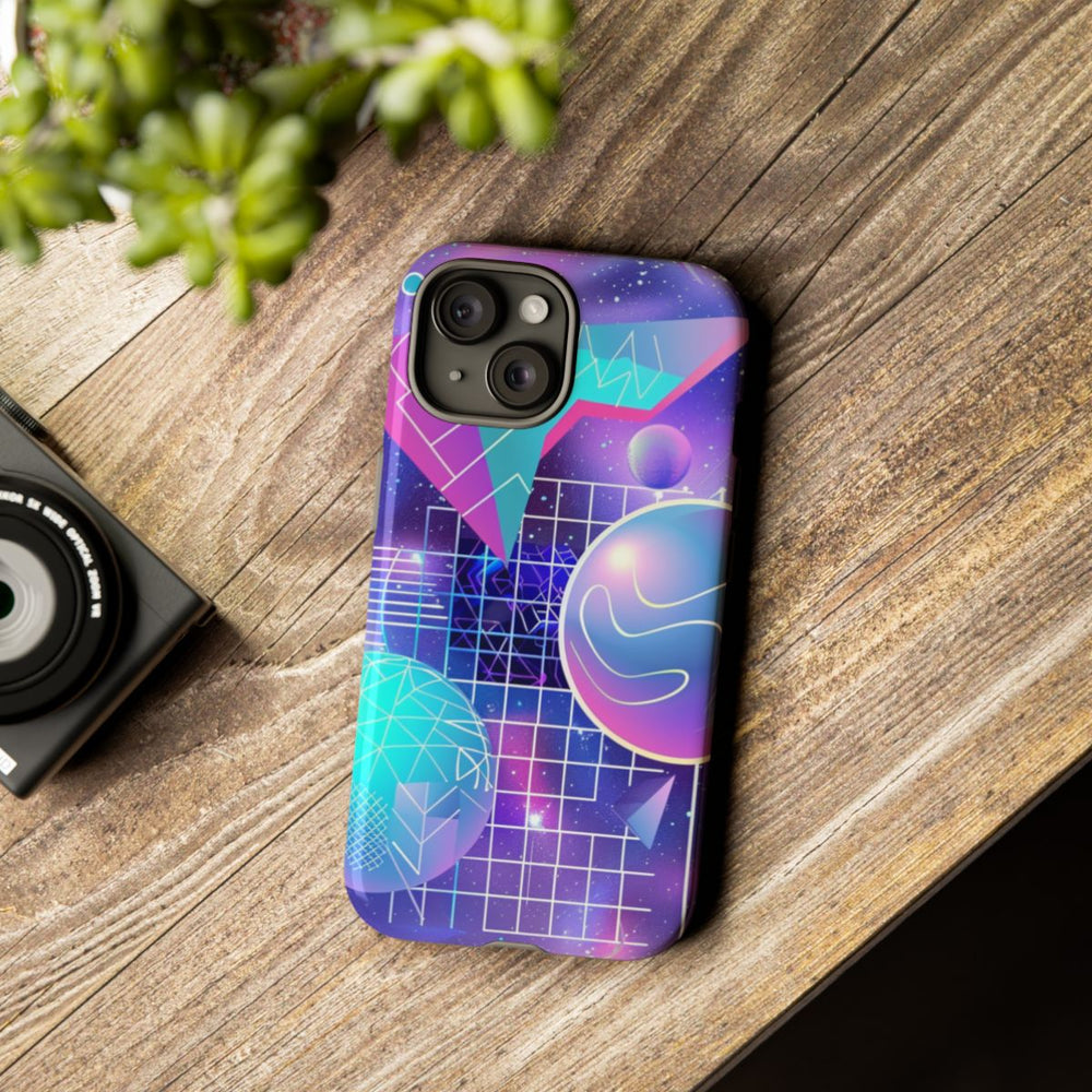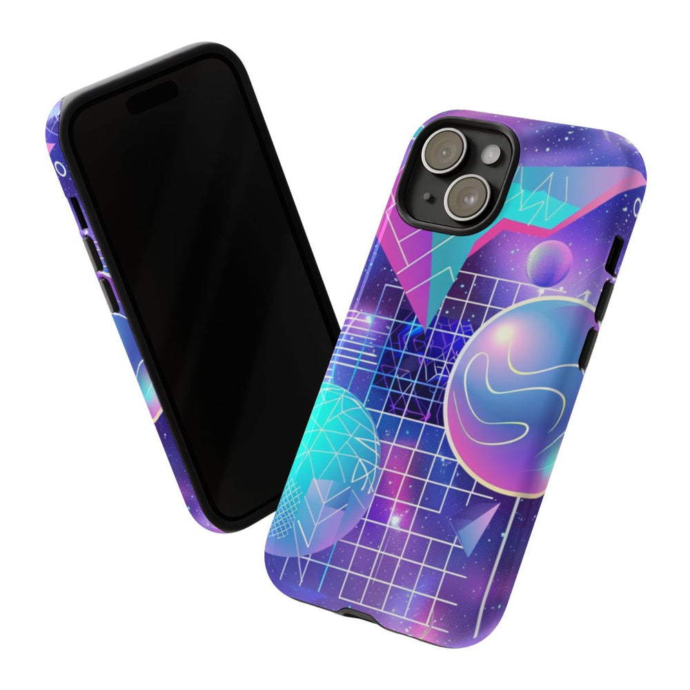Dit hoesje heeft een abstract patroon met een ruimte-thema, bestaande uit verschillende geometrische vormen zoals bollen, piramides en rasterlijnen. De achtergrond is diep kosmisch paars met verspreide stipjes die op sterren lijken en subtiele lichteffecten. De vormen zijn uitgevoerd in levendige tinten blauw, paars en roze met vloeiende kleurovergangen en fijne lijndetails. Het hoesje bestaat uit twee lagen van polycarbonaat en TPU, heeft een glanzende afwerking en biedt extra stevigheid en bescherming. Ondersteunt draadloos opladen.