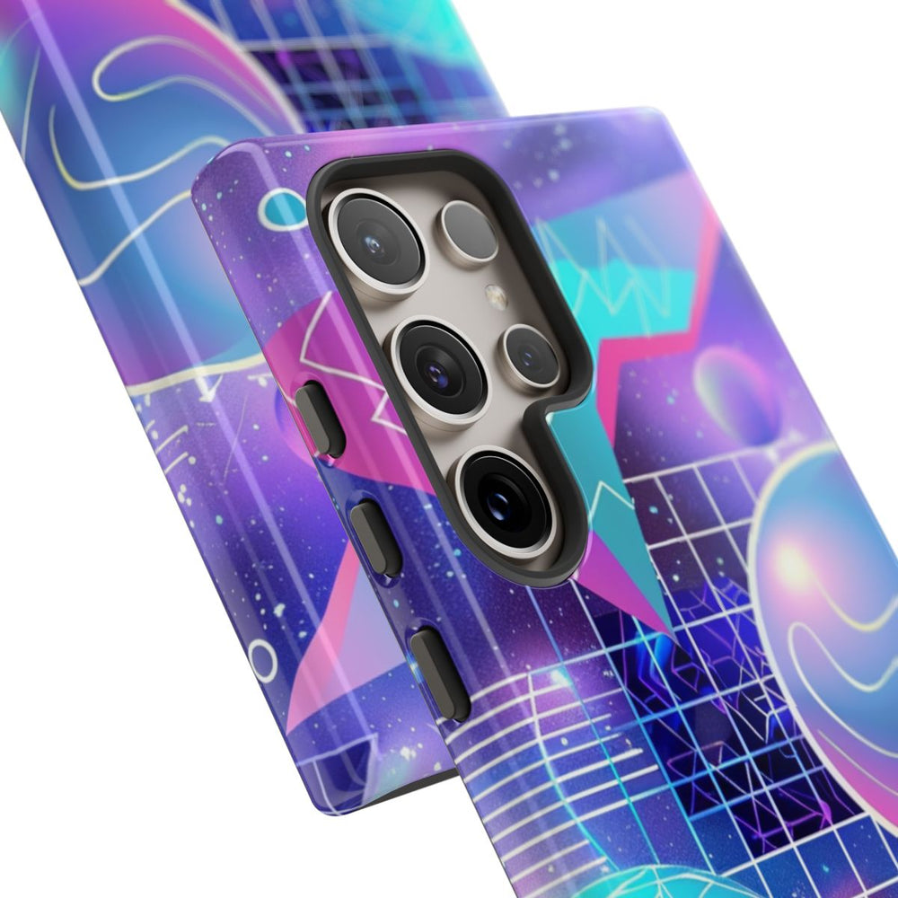 Dit hoesje heeft een abstract patroon met een ruimte-thema, bestaande uit verschillende geometrische vormen zoals bollen, piramides en rasterlijnen. De achtergrond is diep kosmisch paars met verspreide stipjes die op sterren lijken en subtiele lichteffecten. De vormen zijn uitgevoerd in levendige tinten blauw, paars en roze met vloeiende kleurovergangen en fijne lijndetails. Het hoesje bestaat uit twee lagen van polycarbonaat en TPU, heeft een glanzende afwerking en biedt extra stevigheid en bescherming. Ondersteunt draadloos opladen.
