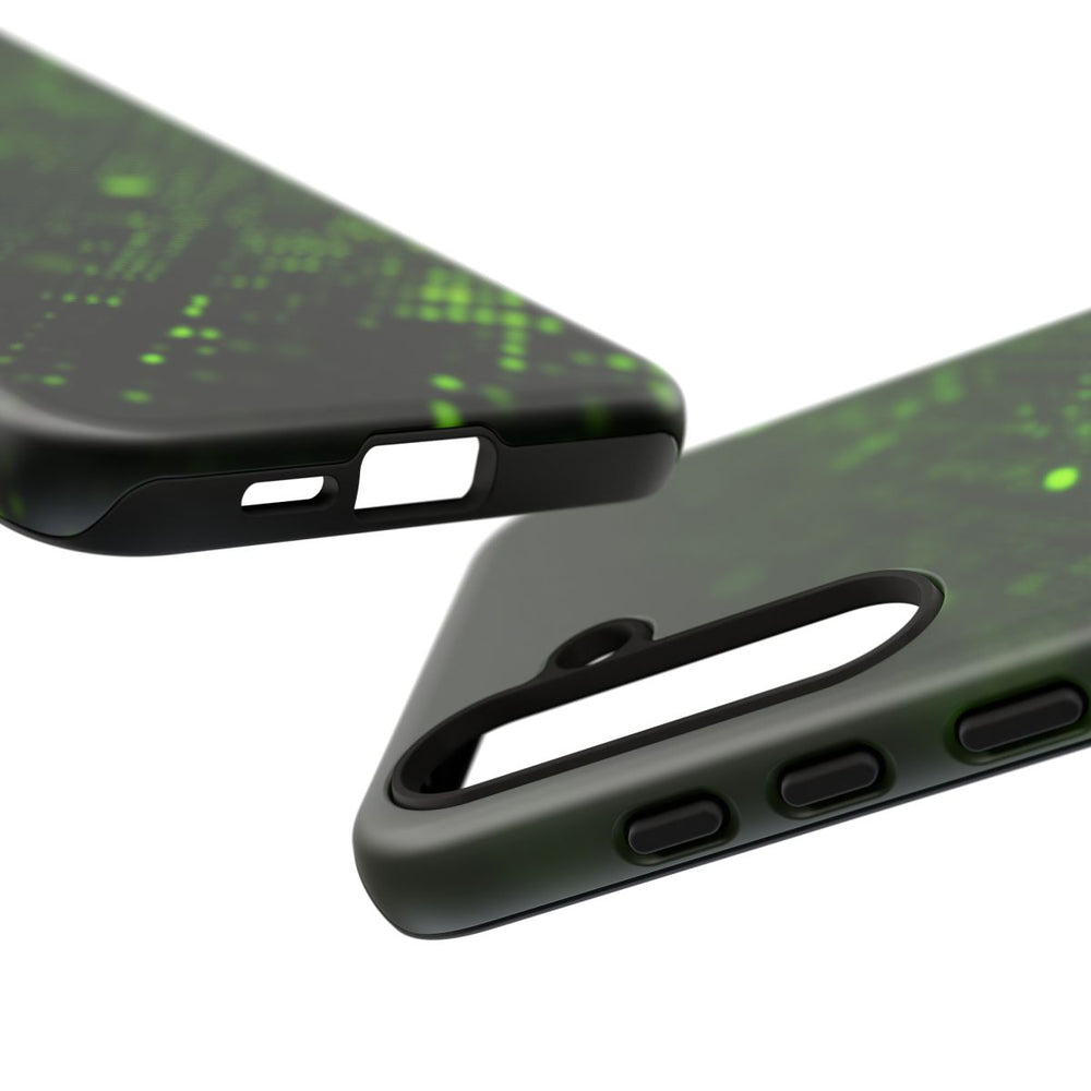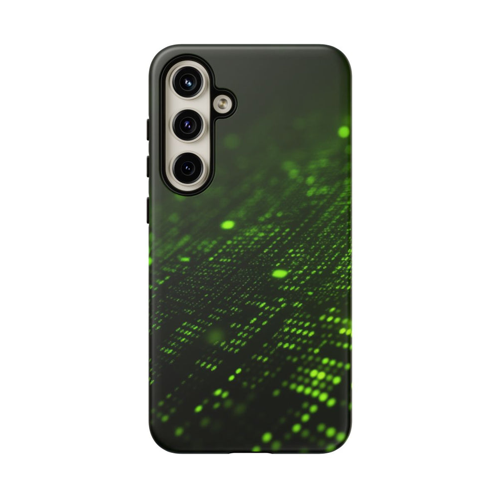 Dit hoesje heeft een abstract digitaal raster van talloze kleine groene deeltjes, gerangschikt in een patroon dat doet denken aan een virtuele of digitale omgeving. De deeltjes verschillen in helderheid, wat zorgt voor diepte en beweging op de donkere achtergrond. Het hoesje bestaat uit twee lagen met een matte afwerking: een stevige buitenkant van polycarbonaat en een TPU-binnenzijde voor extra bescherming en duurzaamheid. Geschikt voor draadloos opladen en ideaal voor gebruik buitenshuis.