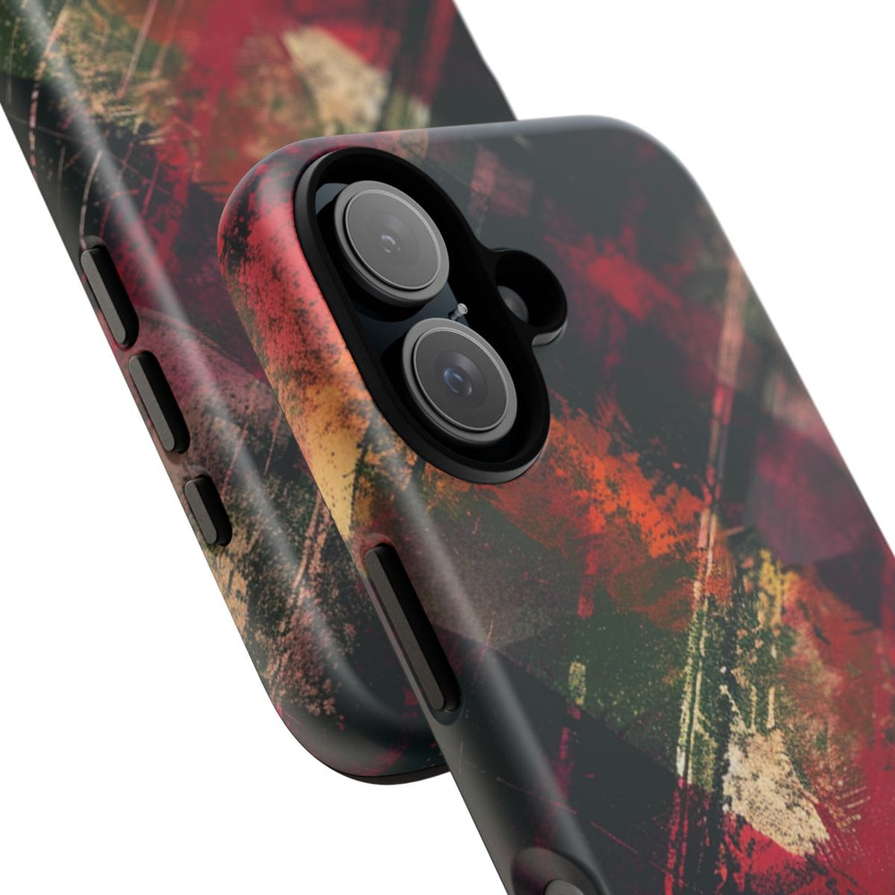 Dit telefoonhoesje heeft een abstract grunge patroon met een mix van donkere en levendige kleuren. Het ontwerp bestaat uit spatten en strepen in rood, bordeaux, oranje, groen en beige, wat zorgt voor een gelaagd en textuurrijk geheel. De dynamische compositie met diagonale lijnen en overlappende vormen geeft het hoesje een gevoel van beweging. Het kunstwerk is gedrukt op een mat hoesje van polycarbonaat en TPU, dat bestaat uit twee beschermende lagen en geschikt is voor draadloos opladen.