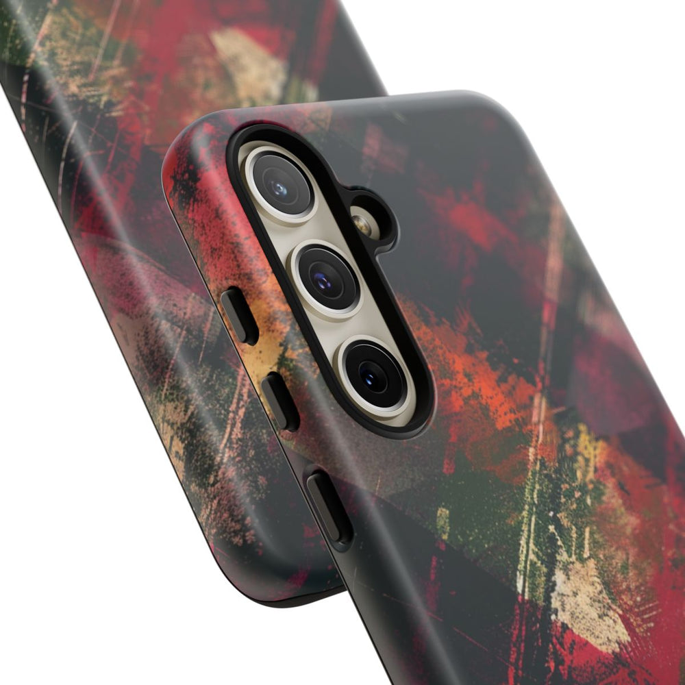 Dit telefoonhoesje heeft een abstract grunge patroon met een mix van donkere en levendige kleuren. Het ontwerp bestaat uit spatten en strepen in rood, bordeaux, oranje, groen en beige, wat zorgt voor een gelaagd en textuurrijk geheel. De dynamische compositie met diagonale lijnen en overlappende vormen geeft het hoesje een gevoel van beweging. Het kunstwerk is gedrukt op een mat hoesje van polycarbonaat en TPU, dat bestaat uit twee beschermende lagen en geschikt is voor draadloos opladen.