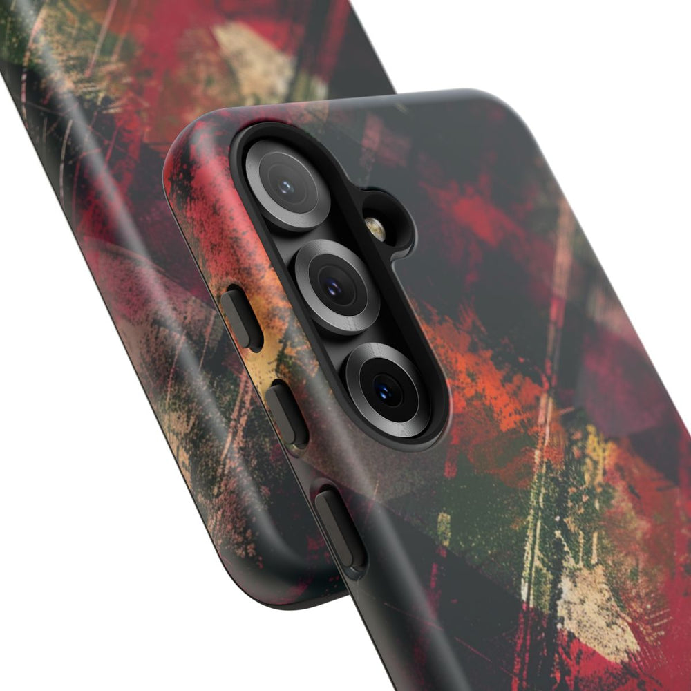 Dit telefoonhoesje heeft een abstract grunge patroon met een mix van donkere en levendige kleuren. Het ontwerp bestaat uit spatten en strepen in rood, bordeaux, oranje, groen en beige, wat zorgt voor een gelaagd en textuurrijk geheel. De dynamische compositie met diagonale lijnen en overlappende vormen geeft het hoesje een gevoel van beweging. Het kunstwerk is gedrukt op een mat hoesje van polycarbonaat en TPU, dat bestaat uit twee beschermende lagen en geschikt is voor draadloos opladen.