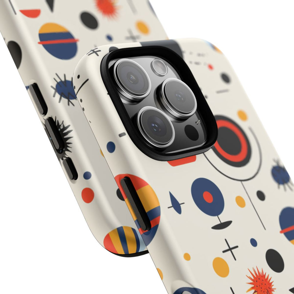 Dit telefoonhoesje is bedrukt met een abstract hemels patroon, bestaande uit diverse geometrische vormen die sterren, planeten, manen en andere ruimte-elementen uitbeelden. De achtergrond heeft een lichte beige kleur, terwijl de vormen voornamelijk zwart, donkerblauw, oranje en geel zijn. Het patroon bestaat uit cirkels, lijnen en sterachtige figuren die speels en herhalend over het geheel zijn verdeeld. Het ontwerp is aangebracht op een mat hoesje van polycarbonaat en TPU, dat dankzij de dubbele laag uitstekende bescherming biedt en geschikt is voor draadloos opladen.
