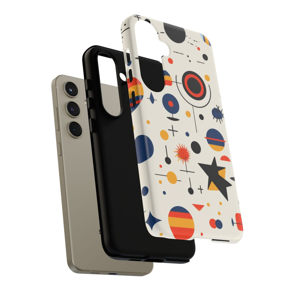Dit telefoonhoesje is bedrukt met een abstract hemels patroon, bestaande uit diverse geometrische vormen die sterren, planeten, manen en andere ruimte-elementen uitbeelden. De achtergrond heeft een lichte beige kleur, terwijl de vormen voornamelijk zwart, donkerblauw, oranje en geel zijn. Het patroon bestaat uit cirkels, lijnen en sterachtige figuren die speels en herhalend over het geheel zijn verdeeld. Het ontwerp is aangebracht op een mat hoesje van polycarbonaat en TPU, dat dankzij de dubbele laag uitstekende bescherming biedt en geschikt is voor draadloos opladen.