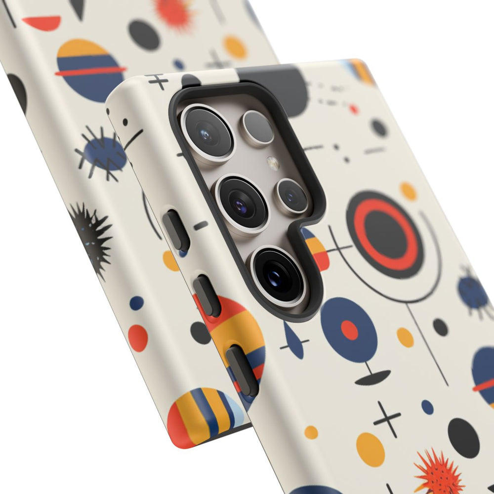 Dit telefoonhoesje is bedrukt met een abstract hemels patroon, bestaande uit diverse geometrische vormen die sterren, planeten, manen en andere ruimte-elementen uitbeelden. De achtergrond heeft een lichte beige kleur, terwijl de vormen voornamelijk zwart, donkerblauw, oranje en geel zijn. Het patroon bestaat uit cirkels, lijnen en sterachtige figuren die speels en herhalend over het geheel zijn verdeeld. Het ontwerp is aangebracht op een mat hoesje van polycarbonaat en TPU, dat dankzij de dubbele laag uitstekende bescherming biedt en geschikt is voor draadloos opladen.