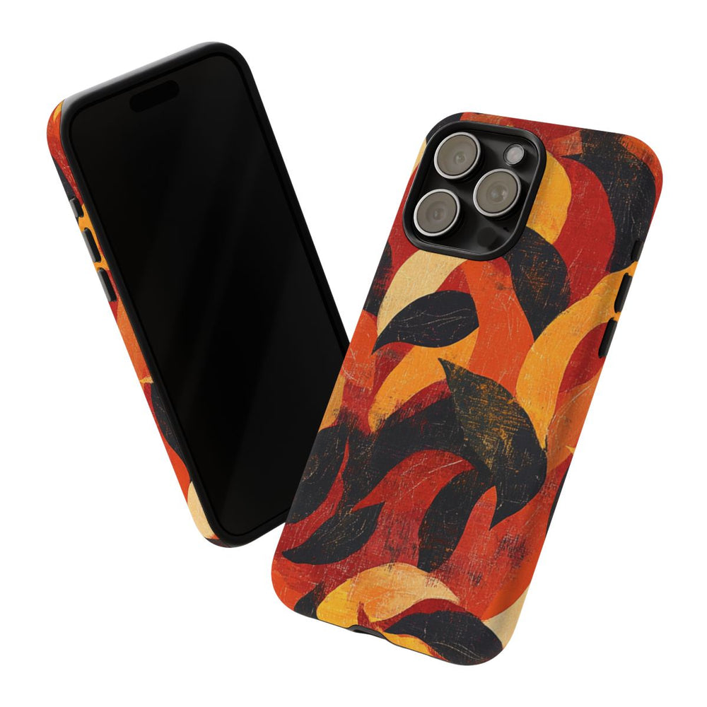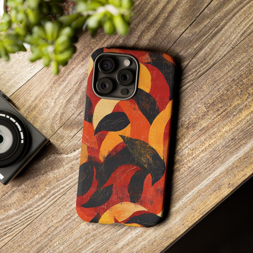 Dit telefoonhoesje is voorzien van een abstract patroon van overlappende bladeren in warme herfstkleuren zoals oranje, rood, geel, beige en zwart. De bladeren hebben een getextureerde, licht verweerde uitstraling, wat zorgt voor een vintage of gedragen effect. Het patroon is dicht en bedekt het volledige oppervlak, waardoor het ontwerp levendig en rijk aan details is. Het matte hoesje heeft een stevige, dubbele laag voor extra duurzaamheid en bescherming, en ondersteunt draadloos opladen.