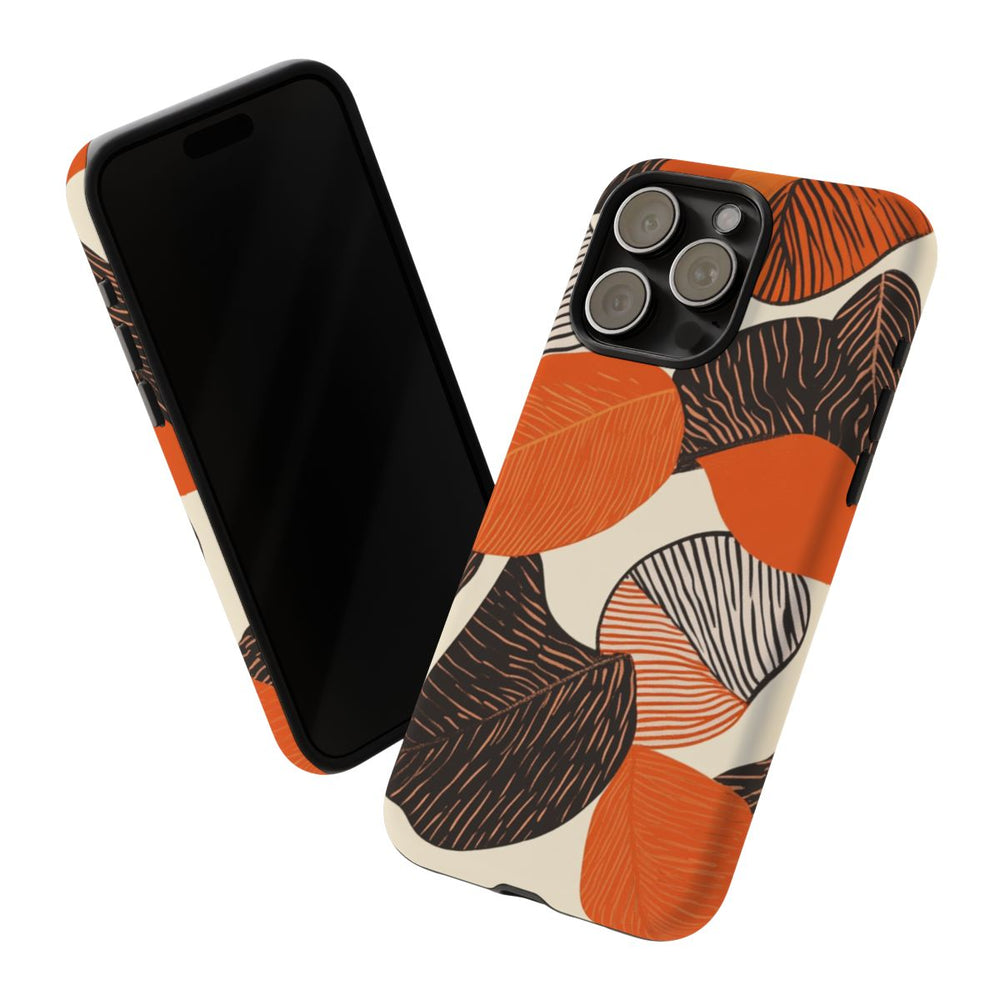 Dit hoesje heeft een abstract patroon van overlappende bladeren in warme herfstkleuren. De bladeren zijn afgebeeld met fijne lijndetails in zwart, oranje en beige, wat zorgt voor een dynamisch en gelaagd effect. De zachte, gebroken witte achtergrond laat de levendige oranje en diepe zwarte vormen extra opvallen. Het patroon is gedrukt op een mat hoesje met een dubbele laag van polycarbonaat en TPU voor optimale stevigheid en bescherming. Dit hoesje is geschikt voor draadloos opladen.