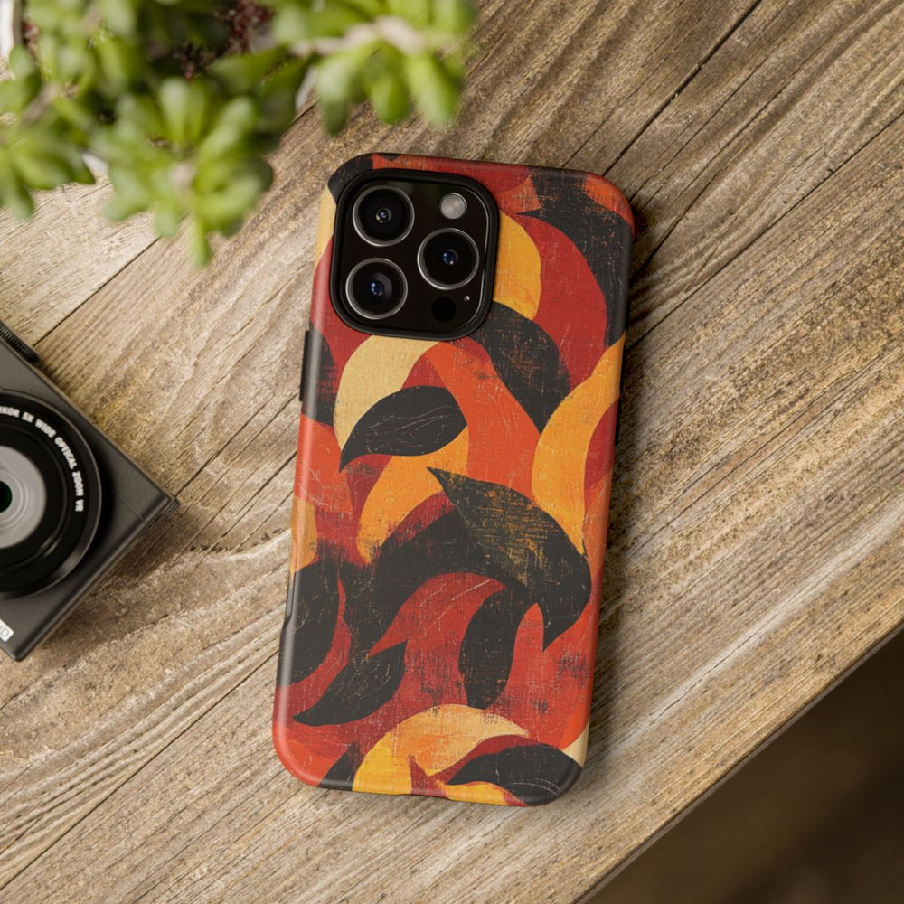 Dit telefoonhoesje is voorzien van een abstract patroon van overlappende bladeren in warme herfstkleuren zoals oranje, rood, geel, beige en zwart. De bladeren hebben een getextureerde, licht verweerde uitstraling, wat zorgt voor een vintage of gedragen effect. Het patroon is dicht en bedekt het volledige oppervlak, waardoor het ontwerp levendig en rijk aan details is. Het matte hoesje heeft een stevige, dubbele laag voor extra duurzaamheid en bescherming, en ondersteunt draadloos opladen.