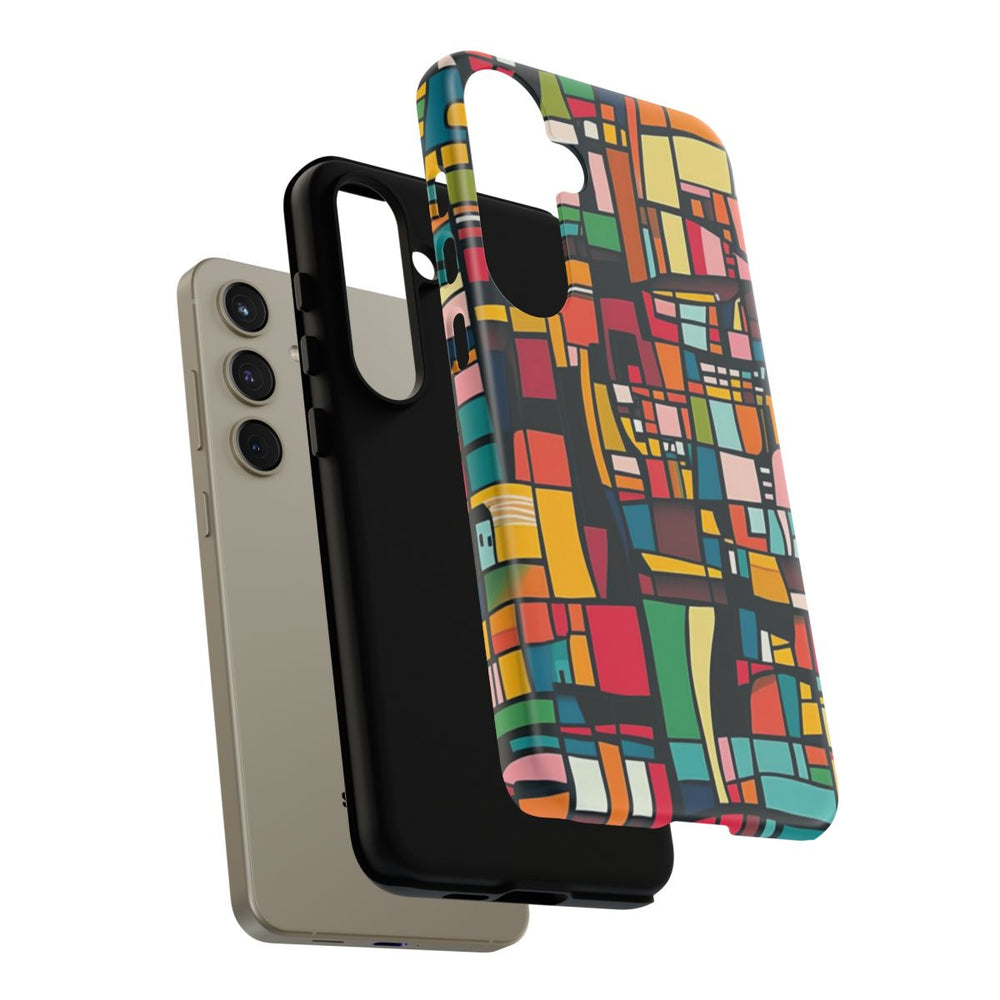 Dit hoesje heeft een opvallend abstract geometrisch patroon met talloze kleine, onregelmatige rechthoeken en vierkanten. De vormen zijn omlijnd in zwart en gevuld met diverse kleuren zoals rood, oranje, geel, groen, turquoise, blauw en crème. Het geheel zorgt voor een eigentijdse en levendige uitstraling. Het hoesje bestaat uit twee lagen met een matte afwerking van polycarbonaat en TPU, biedt extra bescherming en is geschikt voor draadloos opladen.