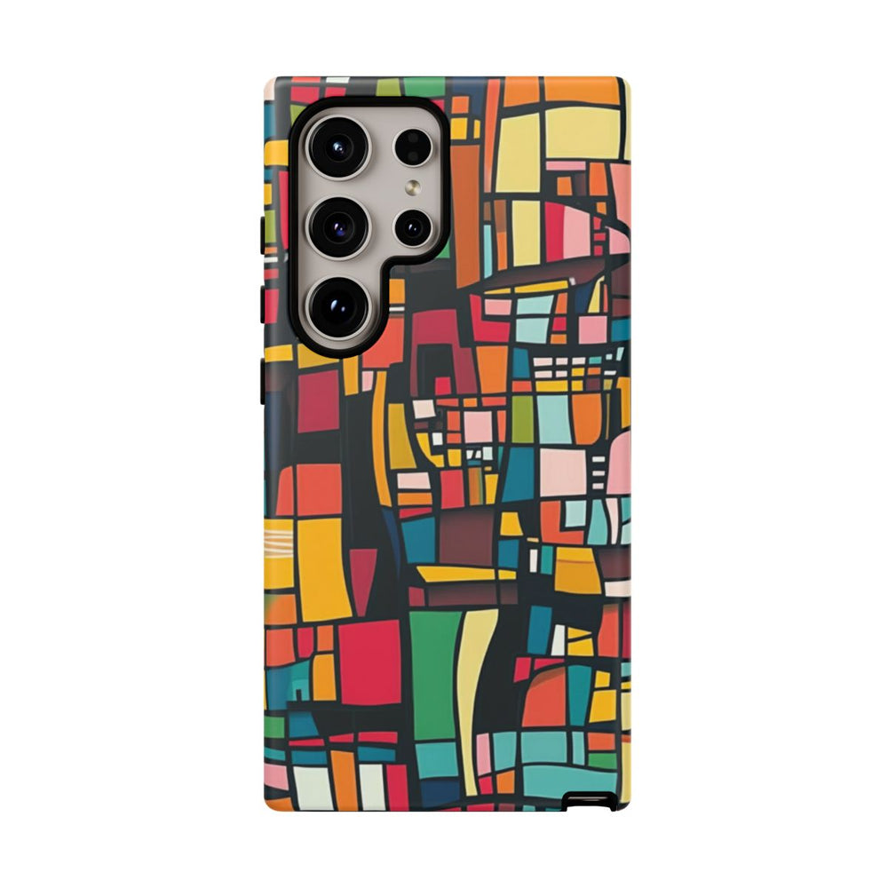 Dit telefoonhoesje is voorzien van een abstract geometrisch patroon met talloze rechthoekige en vierkante vormen in diverse kleuren, zoals rood, oranje, geel, groen, blauw en beige. De vormen zijn omlijnd met zwart, wat zorgt voor een glas-in-lood effect. Het levendige en dynamische patroon bedekt het volledige oppervlak van het matte, stevige hoesje. De buitenkant is gemaakt van polycarbonaat en de binnenzijde van TPU, waardoor het hoesje duurzaam is en optimale bescherming biedt. Het hoesje ondersteunt draadloos opladen en is bestand tegen invloeden van buitenaf.