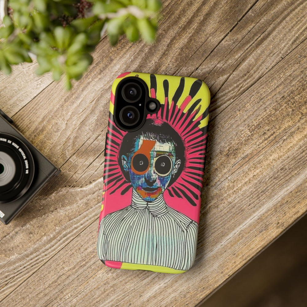 Dit hoesje heeft een abstract portret van een persoon met een veelkleurig gezicht en grote, ronde ogen. De afgebeelde persoon draagt een verticaal gestreept shirt met een hoge kraag. Rond het hoofd is een stralend patroon te zien met zwarte, gele en roze vormen die naar buiten uitstralen en zo een dynamische, levendige achtergrond creëren. Het hoesje bestaat uit twee lagen: een stevige polycarbonaat buitenkant en een TPU-binnenzijde. Het ondersteunt draadloos opladen en is bestand tegen invloeden van buitenaf.