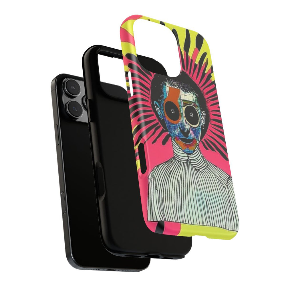 Dit telefoonhoesje toont een abstract portret van een persoon met een veelkleurig gezicht en grote, ronde ogen. De figuur draagt een gestreepte coltrui. Rond het hoofd loopt een stralend patroon met zwarte, roze en gele vormen die naar buiten uitstralen, wat zorgt voor een dynamische en levendige achtergrond. In de achtergrond zijn ook blauwe en groene accenten verwerkt. Het hoesje is gemaakt van polycarbonaat en TPU en heeft een dubbele laag voor extra bescherming. Geschikt voor draadloos opladen.
