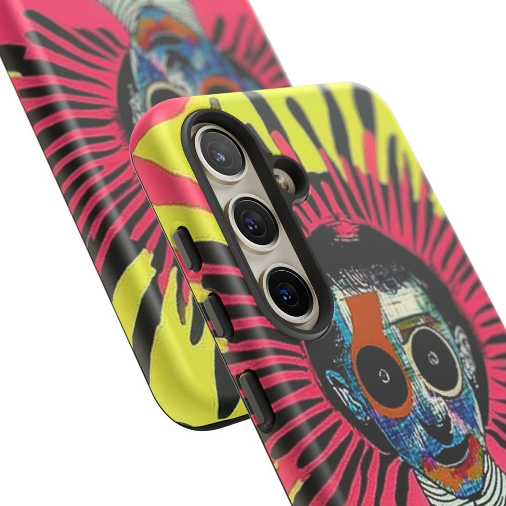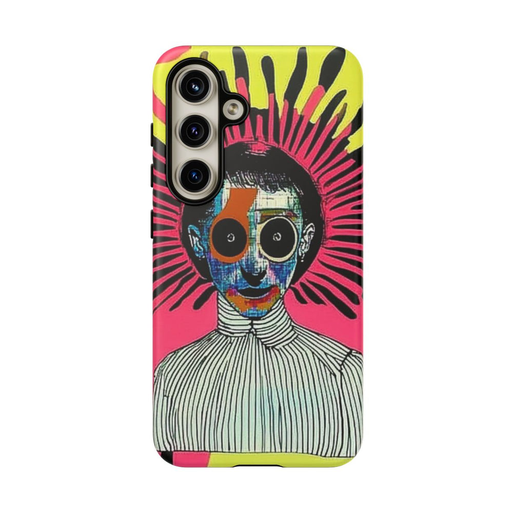 Dit telefoonhoesje heeft een abstract portret van een persoon met een veelkleurig gezicht en grote, ronde ogen. De persoon draagt een zwart-wit gestreept overhemd. Achter het hoofd is een stralend patroon te zien, waarbij zwarte, roze en gele kleuren naar buiten uitstralen. Aan de randen zijn extra accenten in blauw en groen toegevoegd. Het hoesje bestaat uit twee lagen met een stevige polycarbonaat buitenkant en een TPU-binnenzijde, en ondersteunt draadloos opladen.