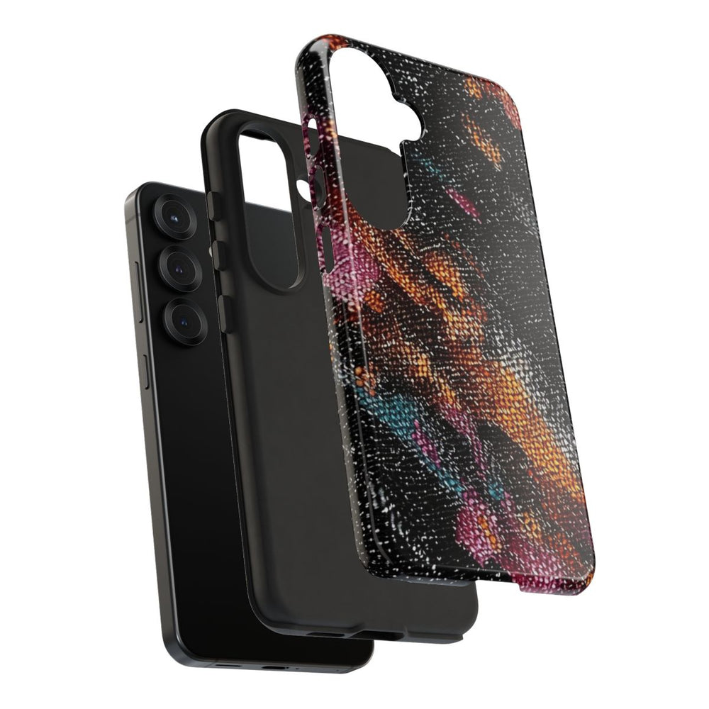 Dit hoesje heeft een opvallend ontwerp met een close-up van een textielpatroon op een zwarte achtergrond. Het patroon bestaat uit levendige tinten oranje, paars, teal en wit, die op een verfijnde manier zijn verweven tot een abstract en dynamisch geheel. De afbeelding benadrukt het gedetailleerde weefsel en het samenspel van kleuren, wat zorgt voor een rijke, artistieke uitstraling. Het hoesje is glanzend, stevig en gemaakt van polycarbonaat en TPU. Dankzij de dubbele beschermlaag is je telefoon extra goed beschermd en draadloos opladen blijft mogelijk.