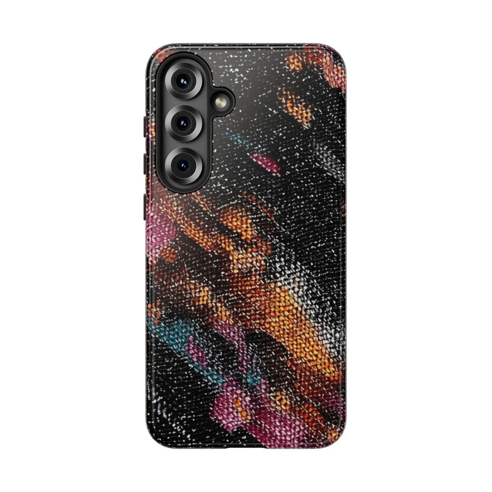 Dit hoesje heeft een opvallend ontwerp met een close-up van een textielpatroon op een zwarte achtergrond. Het patroon bestaat uit levendige tinten oranje, paars, teal en wit, die op een verfijnde manier zijn verweven tot een abstract en dynamisch geheel. De afbeelding benadrukt het gedetailleerde weefsel en het samenspel van kleuren, wat zorgt voor een rijke, artistieke uitstraling. Het hoesje is glanzend, stevig en gemaakt van polycarbonaat en TPU. Dankzij de dubbele beschermlaag is je telefoon extra goed beschermd en draadloos opladen blijft mogelijk.