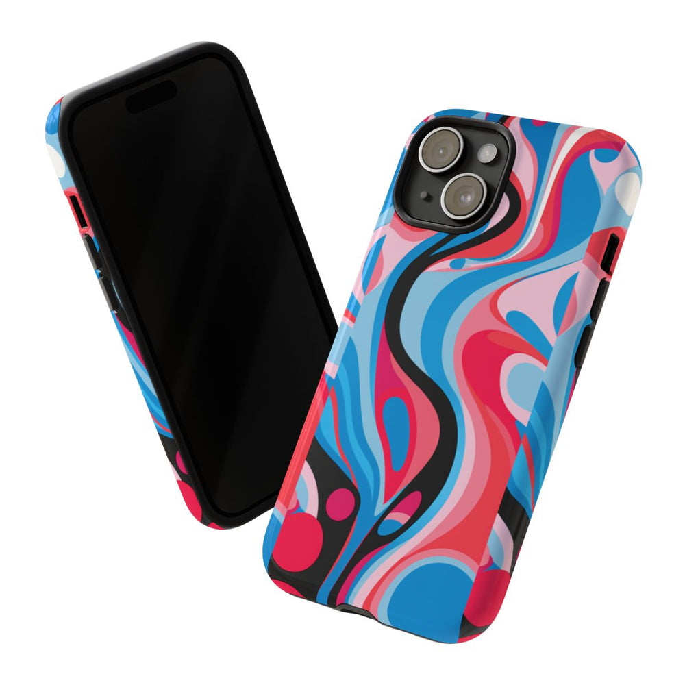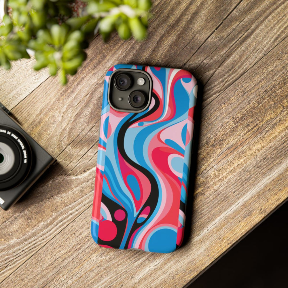 Dit telefoonhoesje heeft een abstract, vloeiend patroon met golvende vormen en rondingen in levendige kleuren. De hoofdkleuren zijn blauw, rood, roze, zwart en wit, wat zorgt voor een dynamisch en opvallend geheel. Het ontwerp bestaat uit soepele, golvende lijnen en cirkelvormen die naadloos in elkaar overlopen. Het hoesje is glanzend afgewerkt en bestaat uit een dubbele laag van polycarbonaat en TPU, wat extra stevigheid en bescherming biedt. Daarnaast ondersteunt het draadloos opladen. Perfect voor liefhebbers van gedurfde en artistieke ontwerpen.