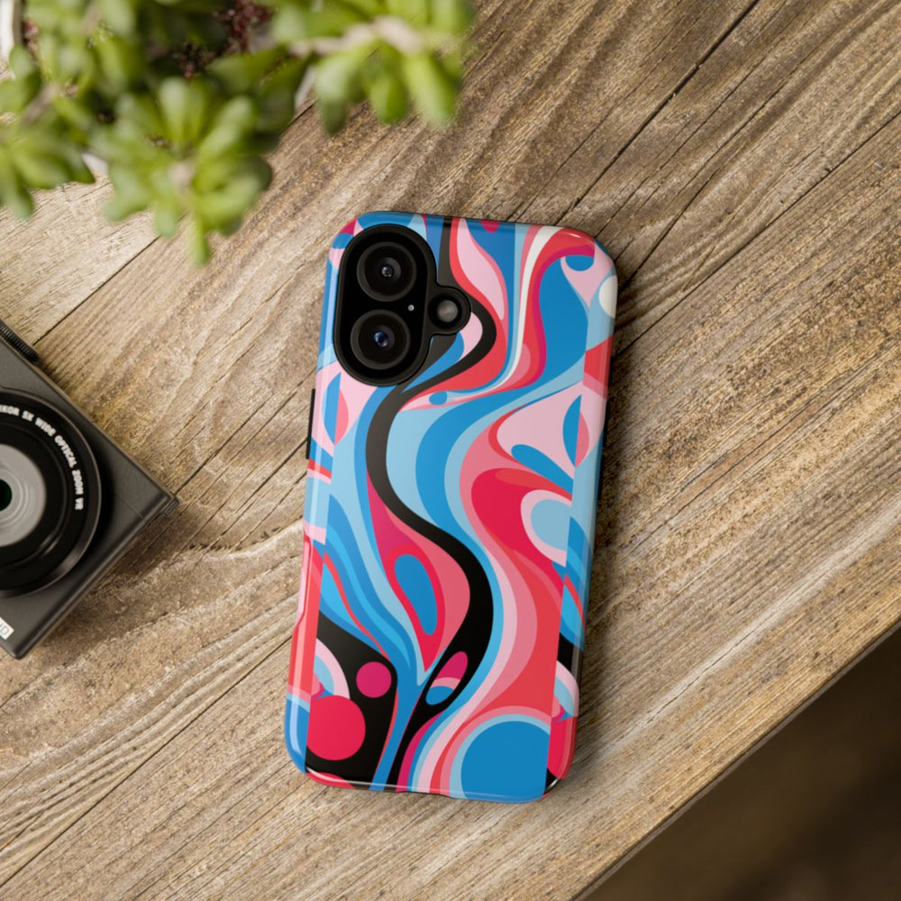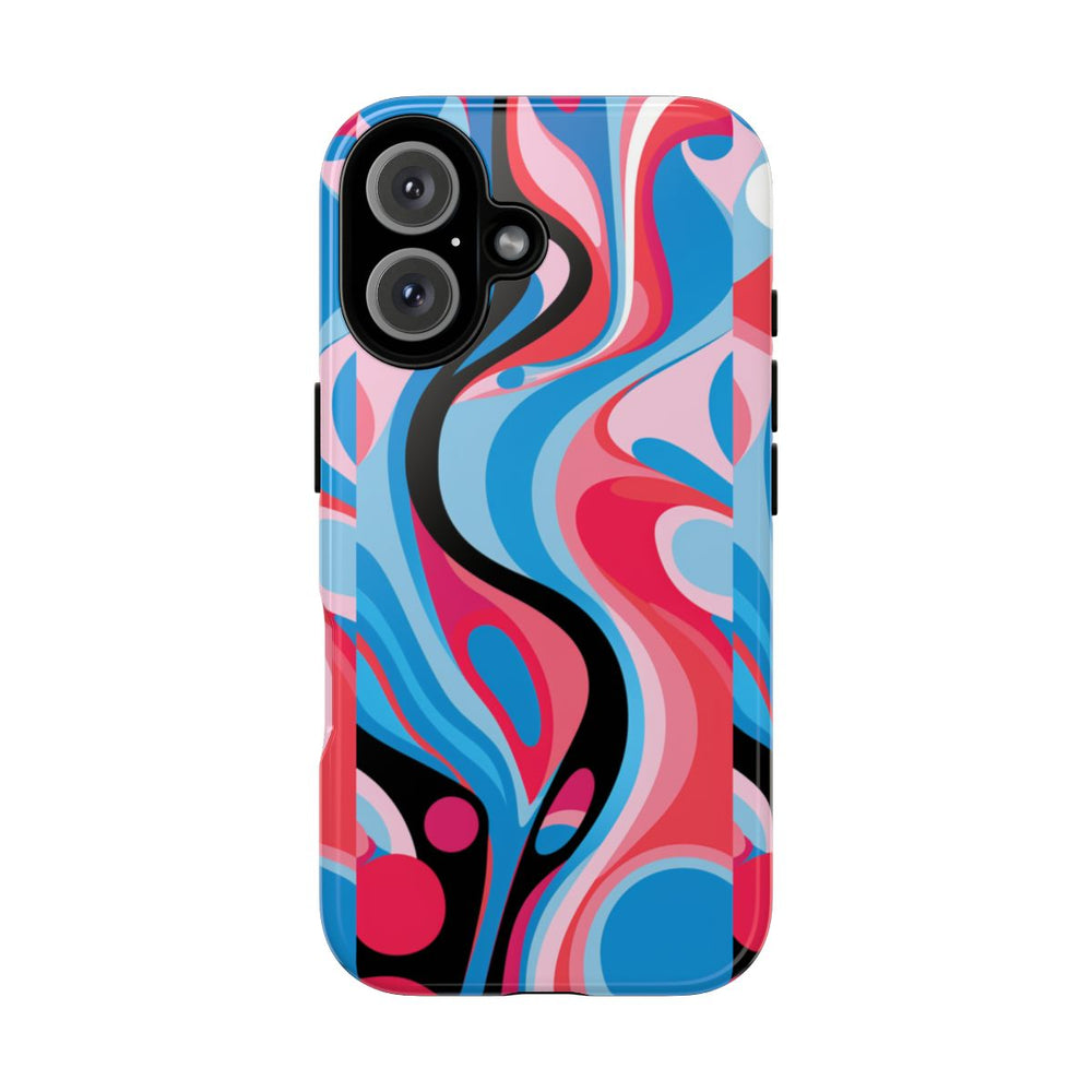 Dit telefoonhoesje heeft een abstract, vloeiend patroon met golvende vormen en rondingen in levendige kleuren. De hoofdkleuren zijn blauw, rood, roze, zwart en wit, wat zorgt voor een dynamisch en opvallend geheel. Het ontwerp bestaat uit soepele, golvende lijnen en cirkelvormen die naadloos in elkaar overlopen. Het hoesje is glanzend afgewerkt en bestaat uit een dubbele laag van polycarbonaat en TPU, wat extra stevigheid en bescherming biedt. Daarnaast ondersteunt het draadloos opladen. Perfect voor liefhebbers van gedurfde en artistieke ontwerpen.