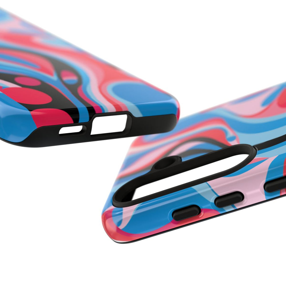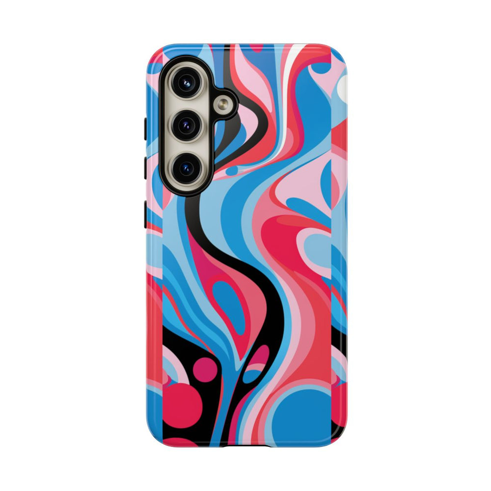 Dit telefoonhoesje heeft een abstract, vloeiend patroon met golvende vormen en rondingen in levendige kleuren. De hoofdkleuren zijn blauw, rood, roze, zwart en wit, wat zorgt voor een dynamisch en opvallend geheel. Het ontwerp bestaat uit soepele, golvende lijnen en cirkelvormen die naadloos in elkaar overlopen. Het hoesje is glanzend afgewerkt en bestaat uit een dubbele laag van polycarbonaat en TPU, wat extra stevigheid en bescherming biedt. Daarnaast ondersteunt het draadloos opladen. Perfect voor liefhebbers van gedurfde en artistieke ontwerpen.
