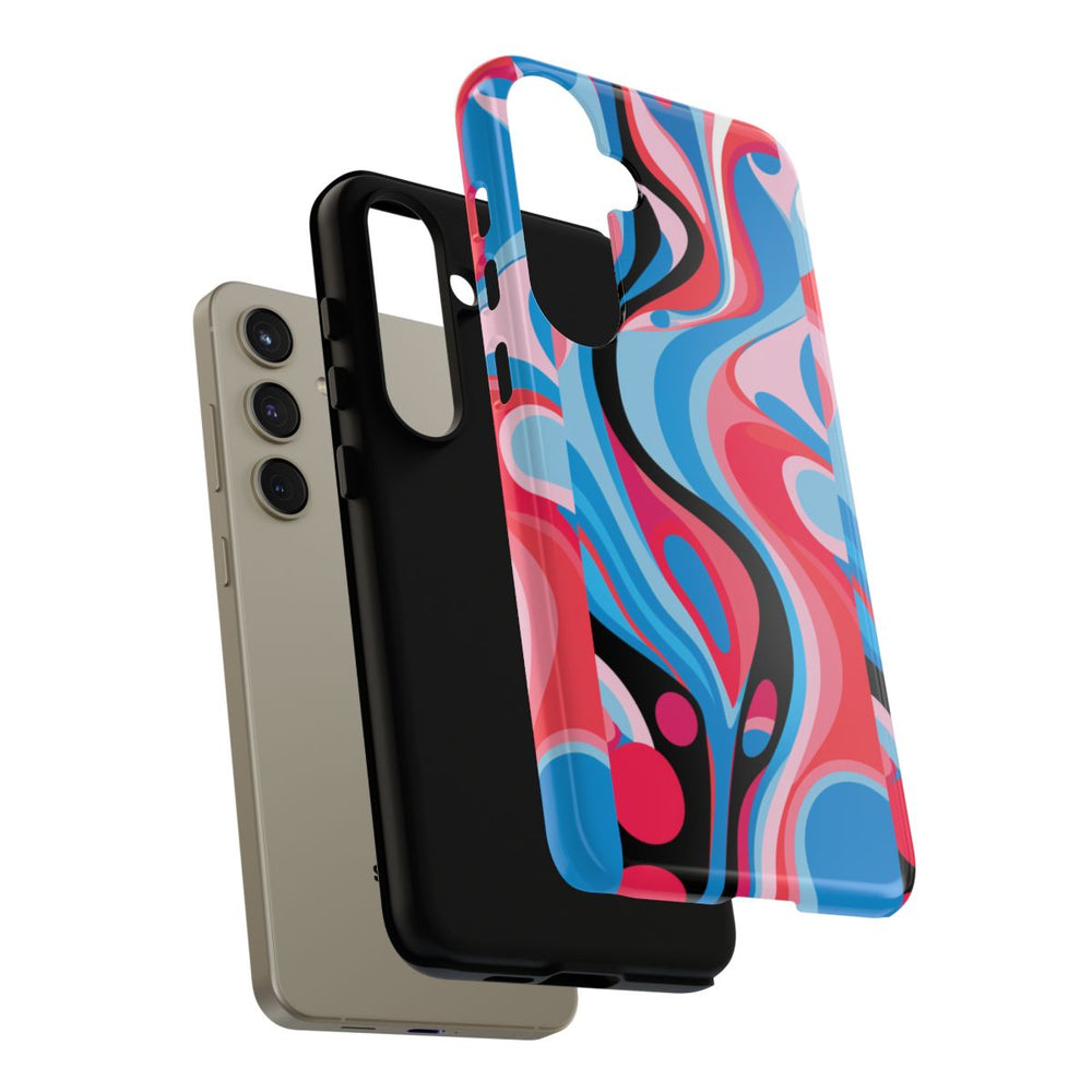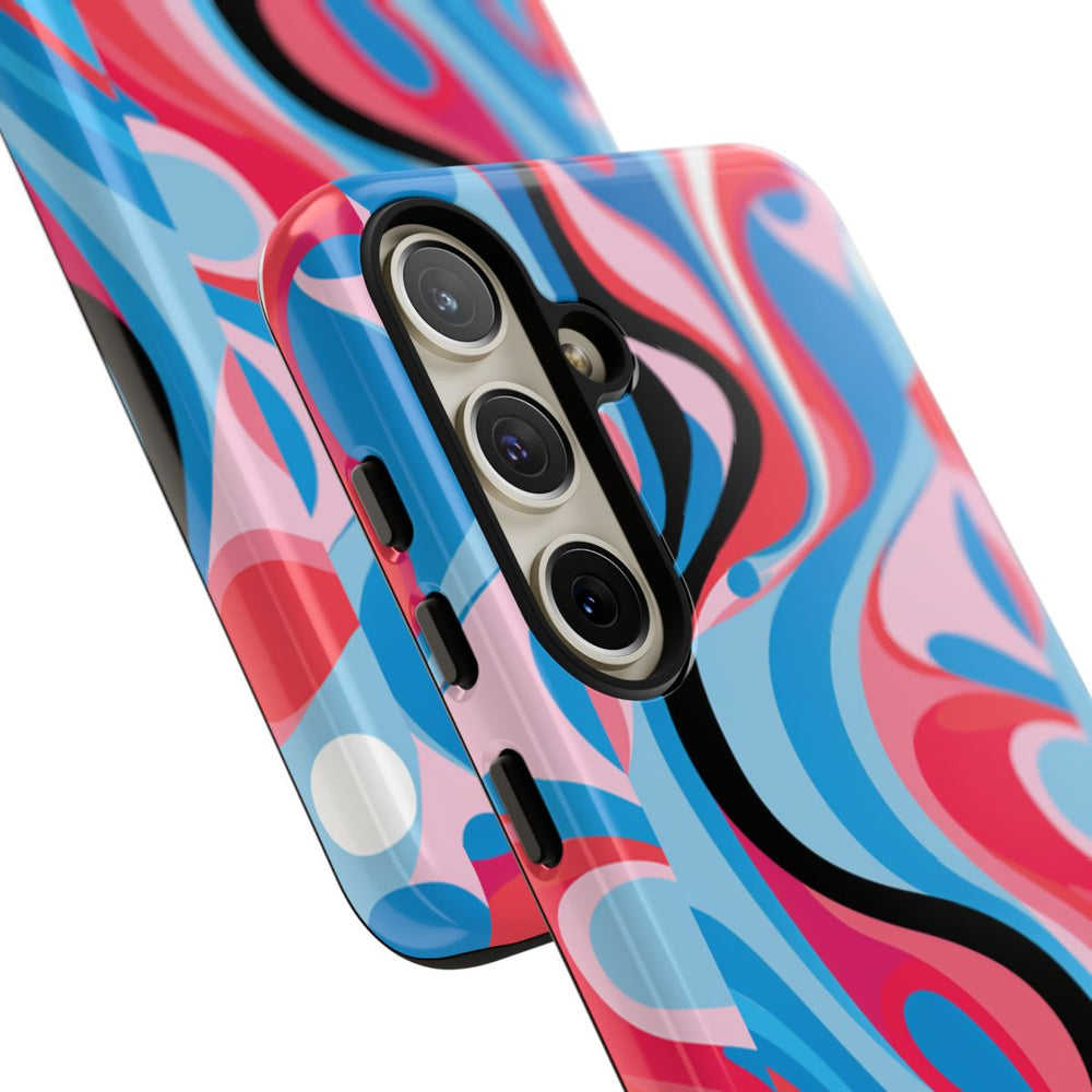 Dit telefoonhoesje heeft een abstract, vloeiend patroon met golvende vormen en rondingen in levendige kleuren. De hoofdkleuren zijn blauw, rood, roze, zwart en wit, wat zorgt voor een dynamisch en opvallend geheel. Het ontwerp bestaat uit soepele, golvende lijnen en cirkelvormen die naadloos in elkaar overlopen. Het hoesje is glanzend afgewerkt en bestaat uit een dubbele laag van polycarbonaat en TPU, wat extra stevigheid en bescherming biedt. Daarnaast ondersteunt het draadloos opladen. Perfect voor liefhebbers van gedurfde en artistieke ontwerpen.