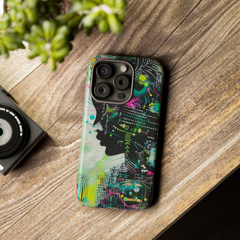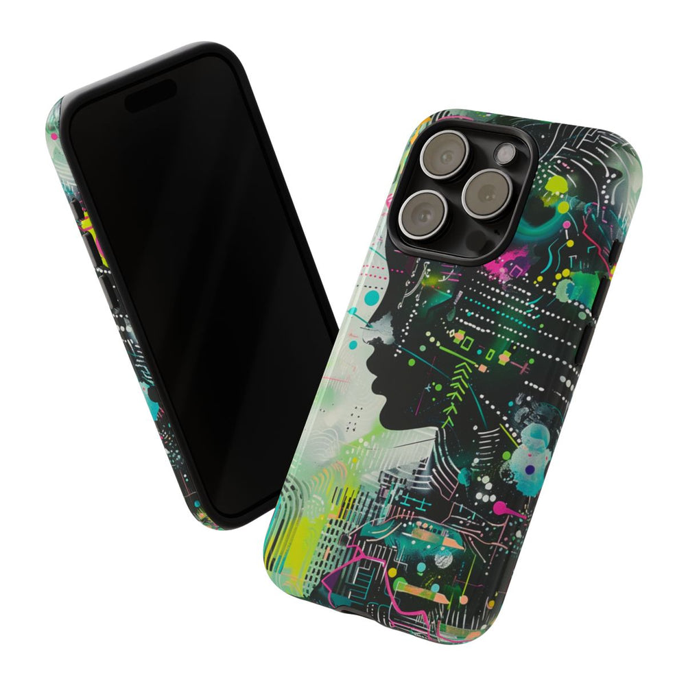 Dit hoesje heeft een zwart silhouet van een menselijk profiel dat is opgevuld met lichtgevende geometrische patronen en symbolen in levendige kleuren zoals aqua, limoengroen, fuchsia en felgeel. De achtergrond bestaat uit een dynamische mix van abstracte penseelstreken, stippen, golven en rasters in tinten groen en wit. De stijl is artistiek en symbolisch, met veel textuur en een futuristische uitstraling. Het hoesje heeft een glanzende afwerking, bestaat uit twee beschermende lagen en is geschikt voor draadloos opladen.