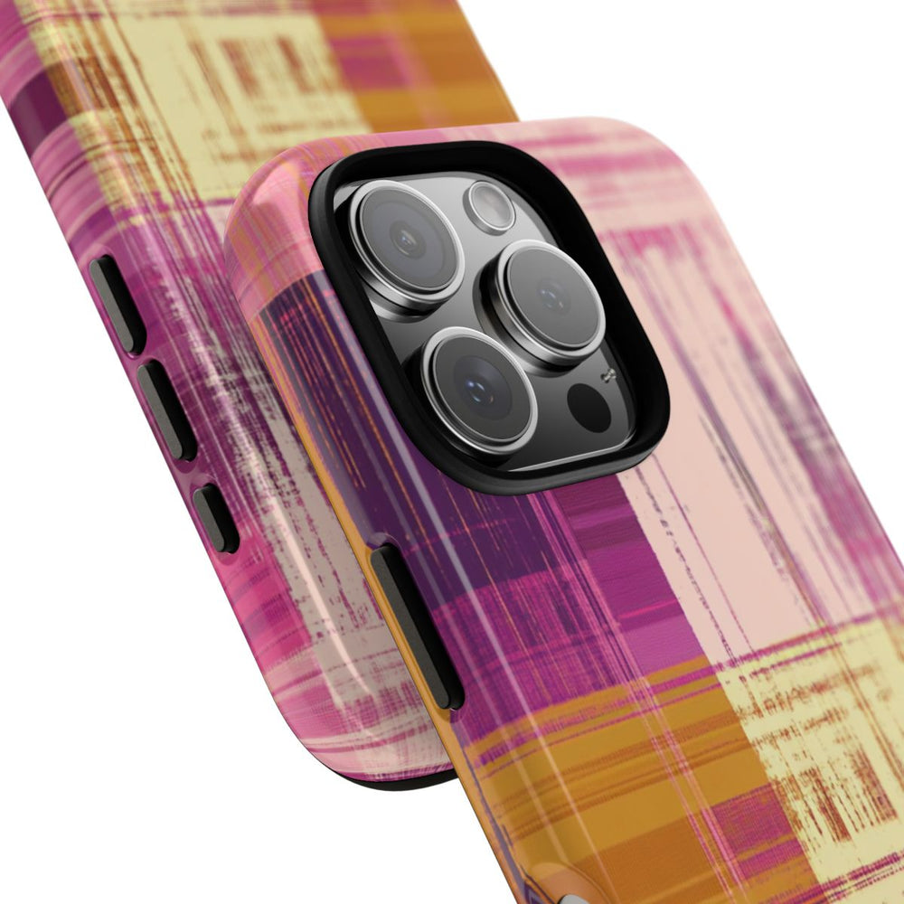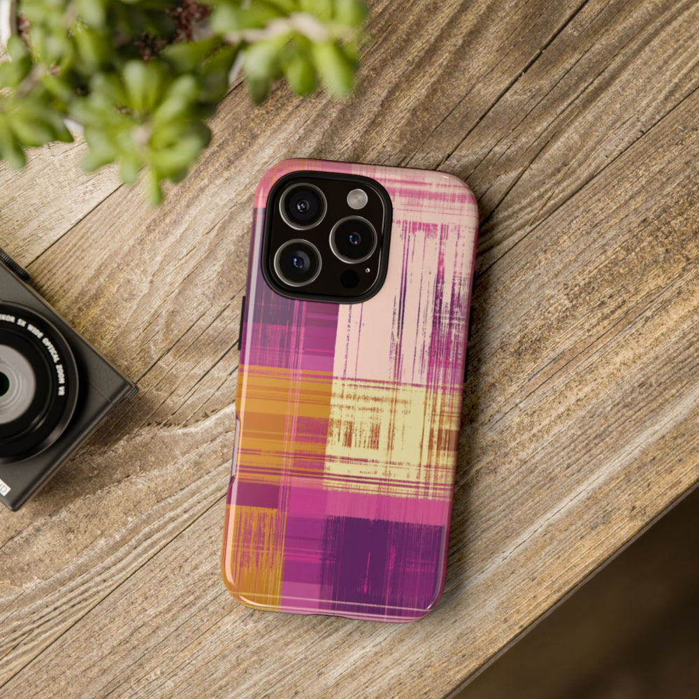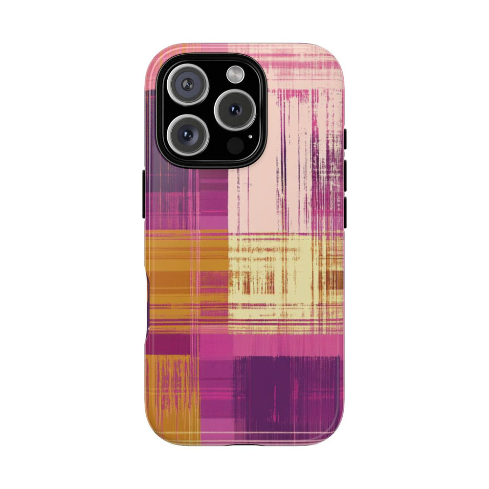 Dit telefoonhoesje heeft een abstract ruitpatroon met een overwegend paarse achtergrond, aangevuld met accenten in goud en roze. Het patroon heeft een geborstelde, textuurachtige uitstraling door de verticale en horizontale lijnen, waardoor een gelaagd, rasterachtig effect ontstaat. De kleuren vloeien zacht in elkaar over en sommige delen hebben een licht verweerde look, wat extra diepte en karakter geeft. Het ontwerp is aangebracht op een glanzend, stevig hoesje van polycarbonaat en TPU voor optimale bescherming en ondersteuning van draadloos opladen.