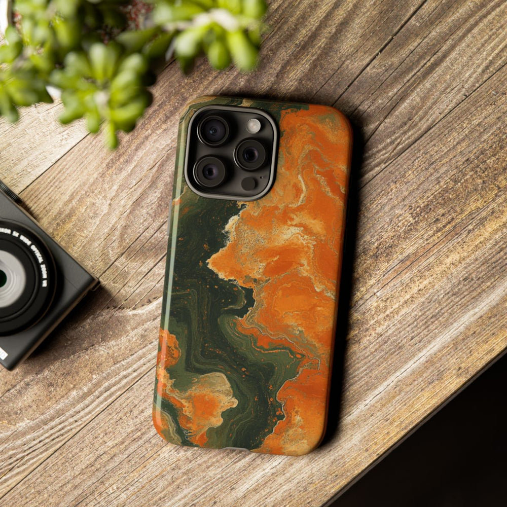 Dit hoesje heeft een abstract patroon met golvende vormen in gebrand oranje, olijfgroen en beige tinten. De kleuren vloeien in elkaar over en zorgen voor een gemarmerd effect met een subtiele metallic glans. Het patroon bedekt het volledige oppervlak en geeft het hoesje een dynamische, artistieke uitstraling. Dit glanzende en stevige hoesje is opgebouwd uit een dubbele laag met een polycarbonaat buitenkant en een TPU binnenzijde, wat zorgt voor extra duurzaamheid en bescherming, ook buitenshuis. Ondersteunt draadloos opladen, maar is niet geschikt voor MagSafe.