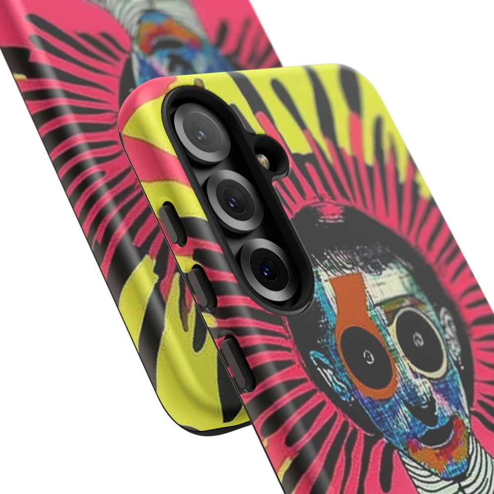 Dit hoesje heeft een abstract, psychedelisch portret van een persoon met een gestreept shirt. Het gezicht is veelkleurig en heeft opvallend grote, ronde ogen in zwart en oranje. Rond het hoofd straalt een patroon van roze, gele en zwarte vormen die doen denken aan zonnestralen. De achtergrond bevat spatten blauw en groen, wat zorgt voor een levendig en dynamisch geheel. Het hoesje bestaat uit twee lagen: een stevige polycarbonaat buitenkant en een TPU-binnenzijde. Ondersteunt draadloos opladen.