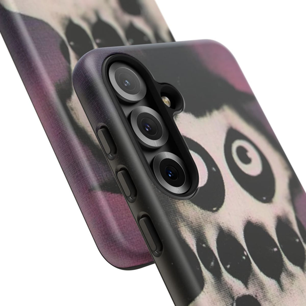 Dit hoesje is voorzien van een surrealistisch, abstract wezen met grote, ronde ogen en meerdere donkere cirkelvormige details op het gezicht. De afbeelding is geplaatst tegen een vervaagde paarse en zwarte achtergrond, wat zorgt voor een mysterieuze en onheilspellende sfeer. Het matte, stevige telefoonhoesje is gemaakt van polycarbonaat en TPU en biedt dubbele bescherming. Geschikt voor draadloos opladen.